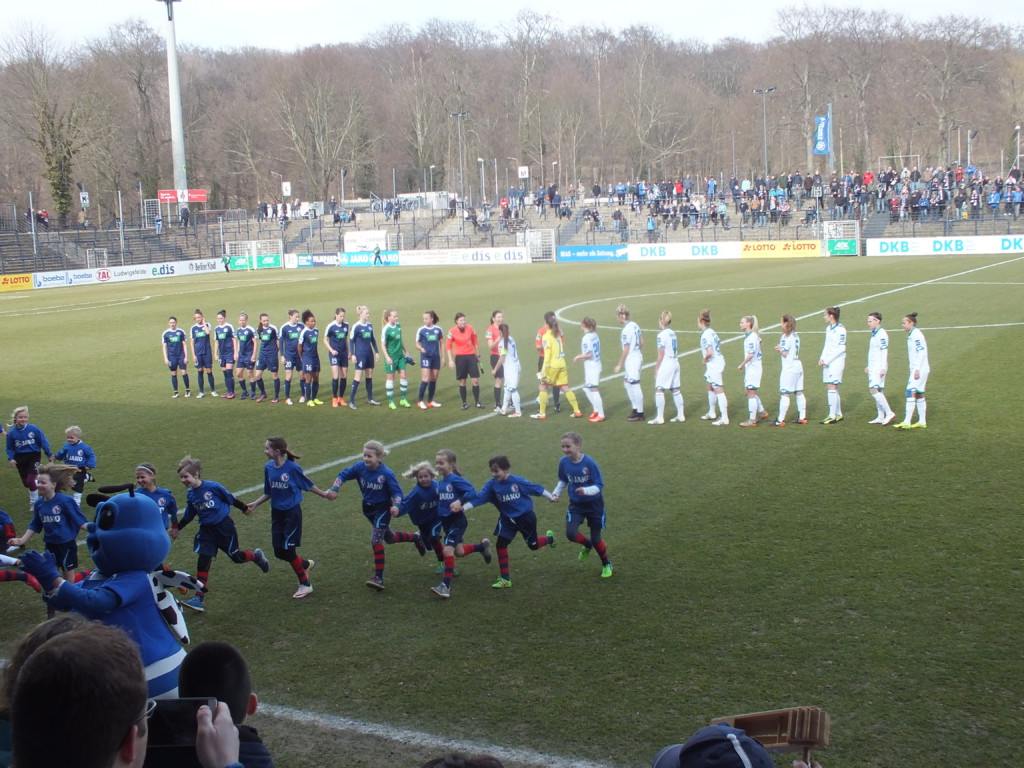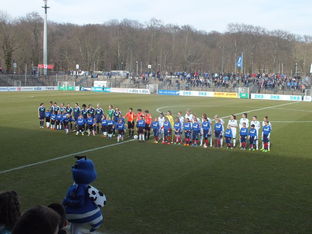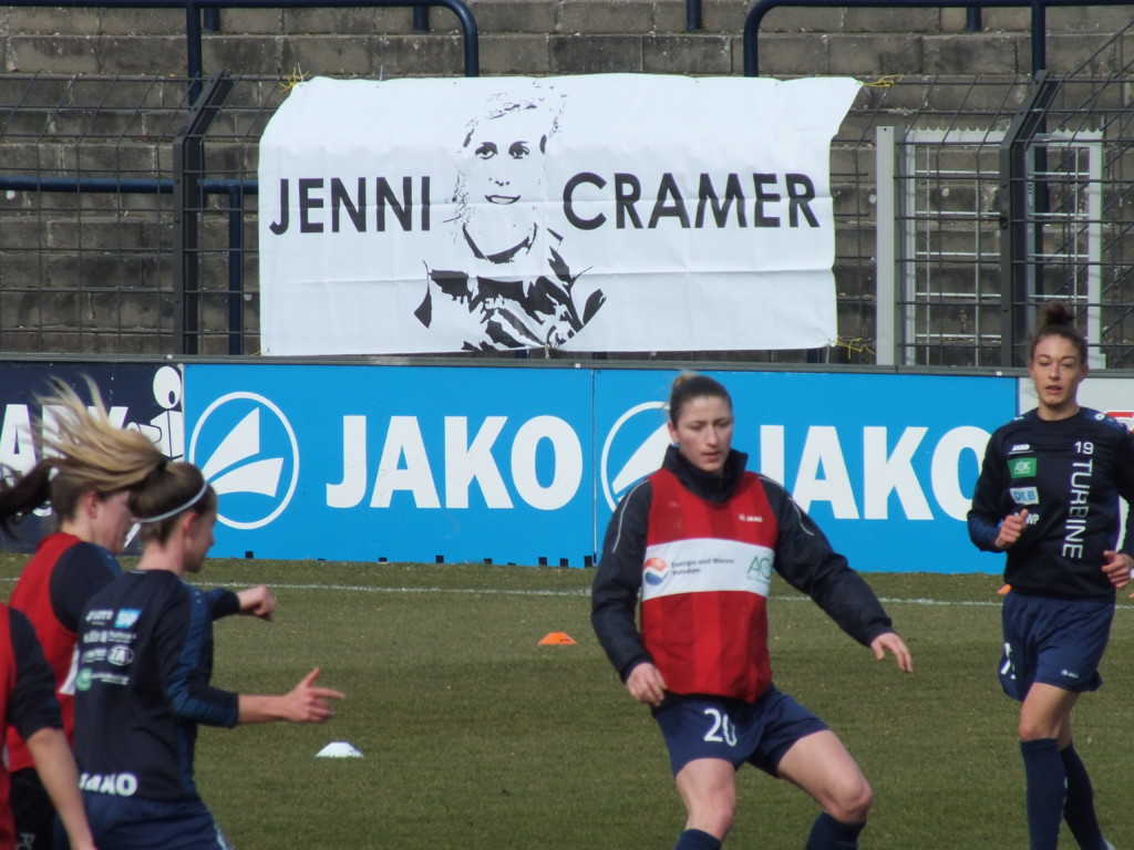 Spiel Nr.2 der Rückrunde, wiederum ohne das Sturmduo Kemme/Huth, dafür aber mit einem emotional geprägten Comeback von Jennifer Cramer, ehemals Nationalspielerin, die 15 Monate geduldig und genervt ihre Knöchelverletzung incl. zwei OP’s auskurierte. Ein aus 100 Meter Entfernung gut lesbares Fanbanner ausschließlich für die “ Jenny mit i“ tat sein ergänzendes Wohlgefallen.