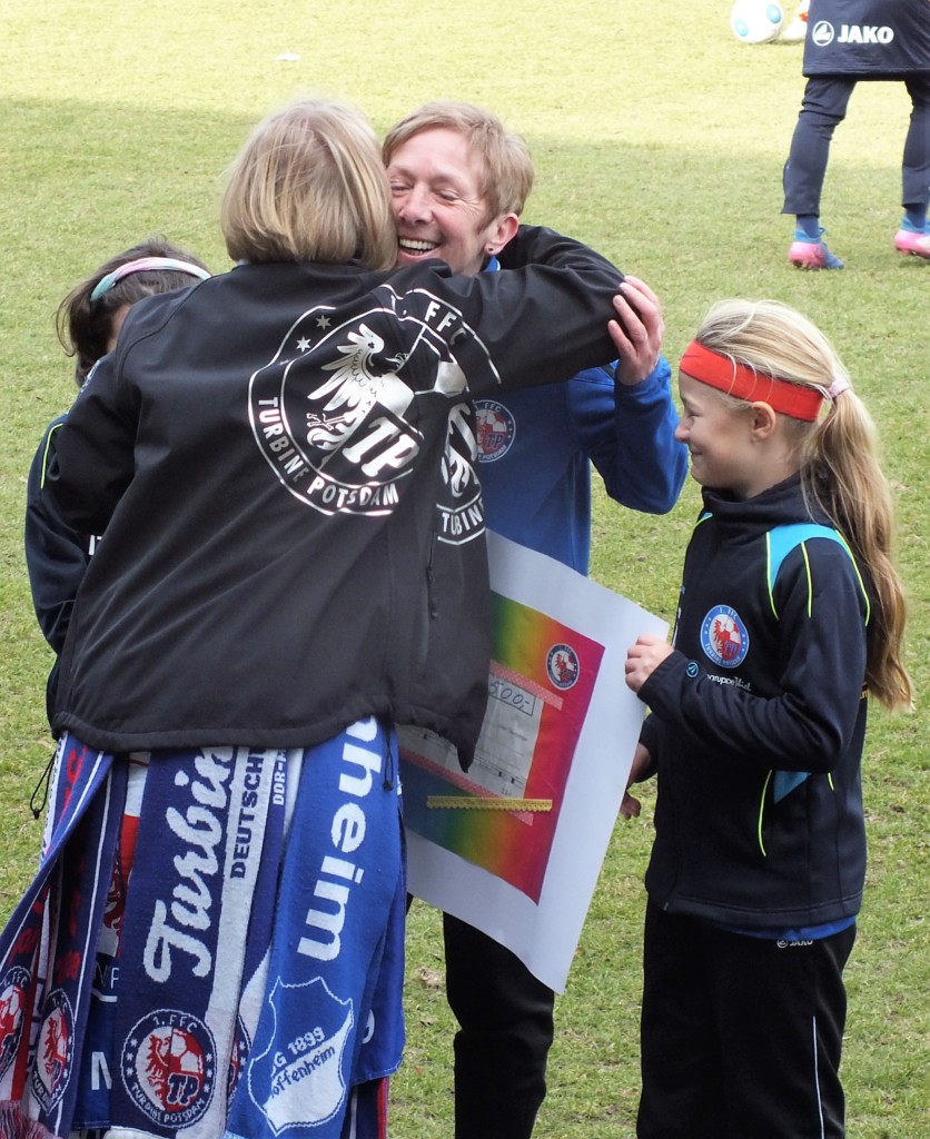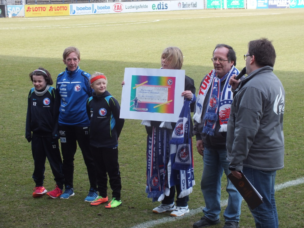 dass der Fanclub „Turbinefans“ in der Halbzeitpause eine 500€-Spende an den Nachwuchsbereich von Turbine Potsdam übergab, den die Trainerin Bettina Stoof und zwei Turbinchen dankend in Empfang nahmen.