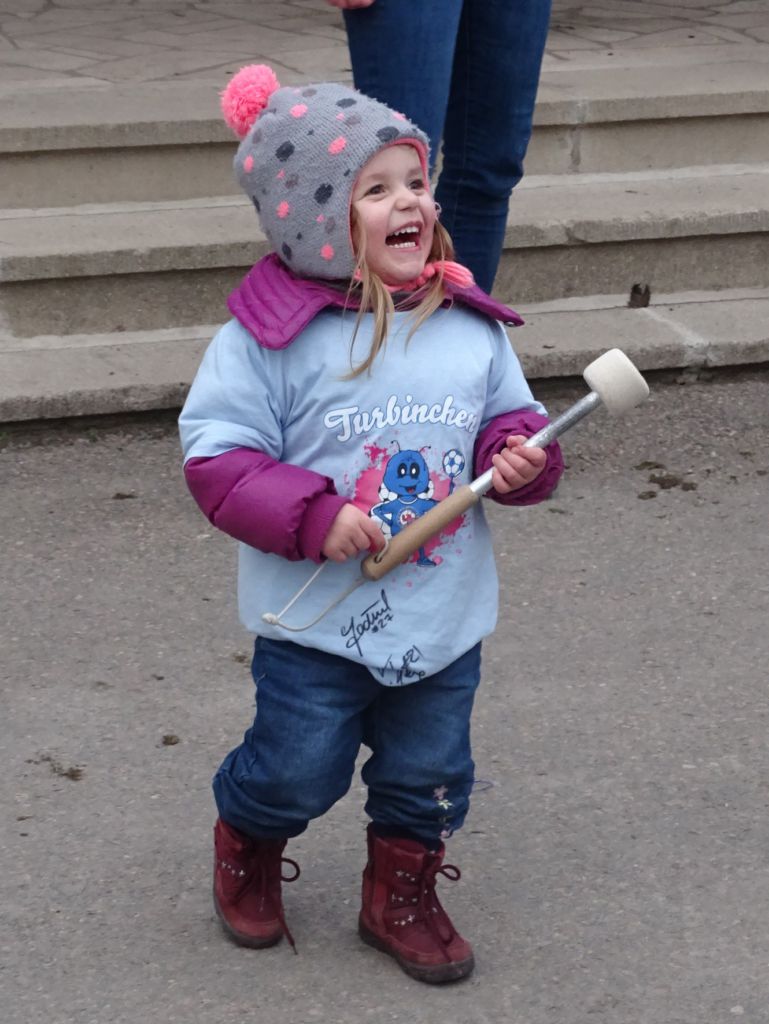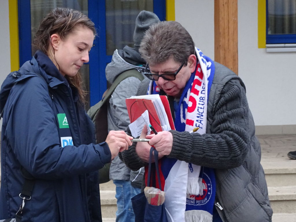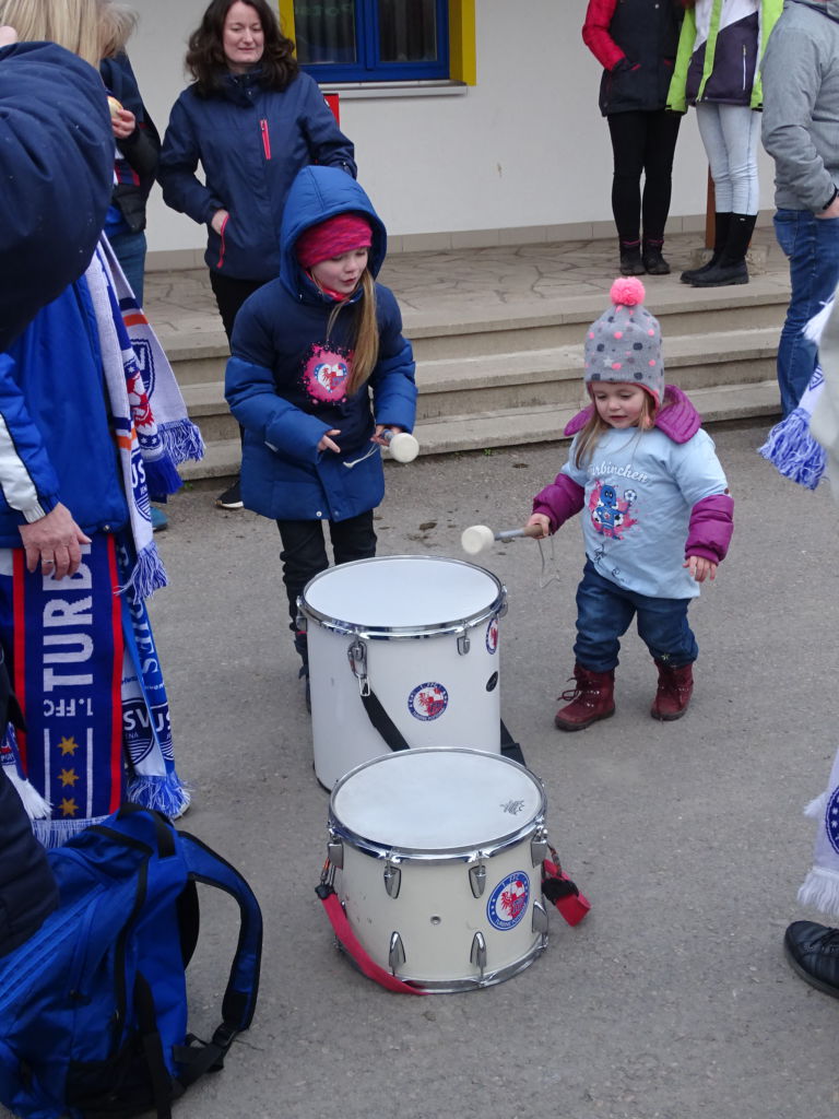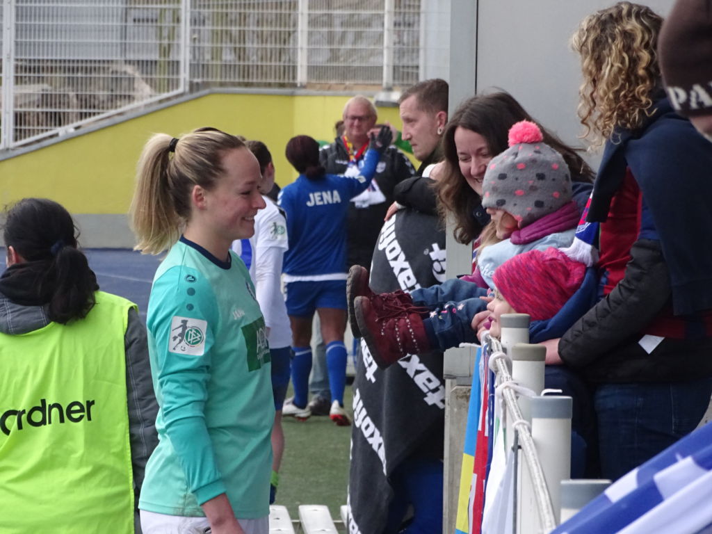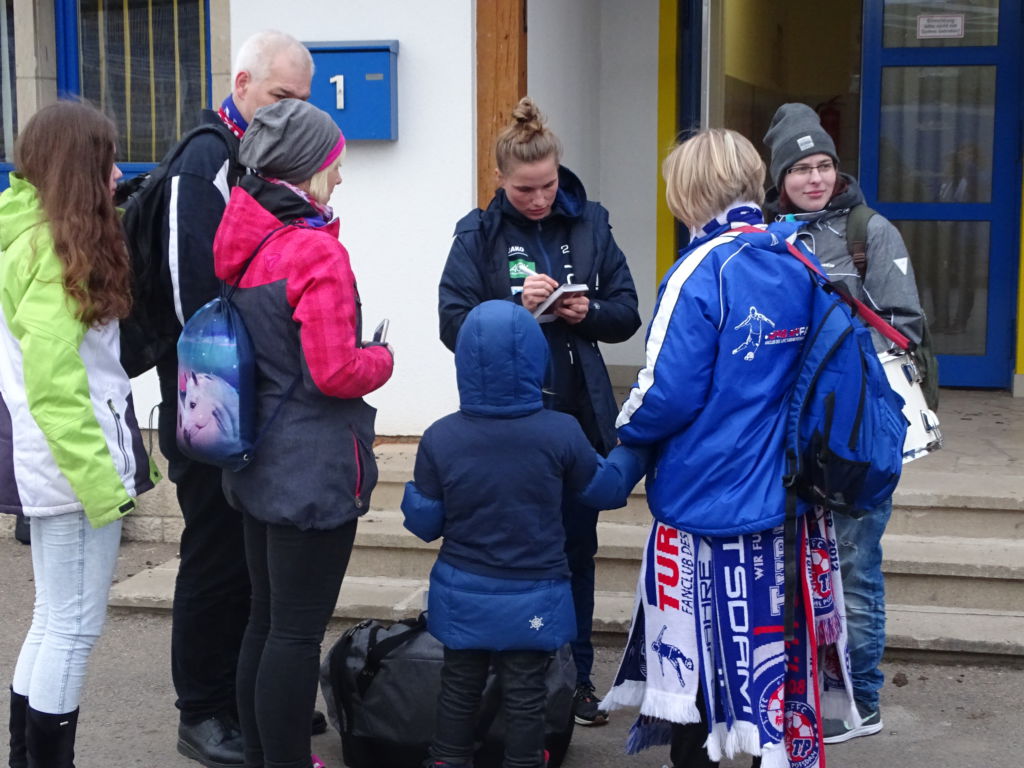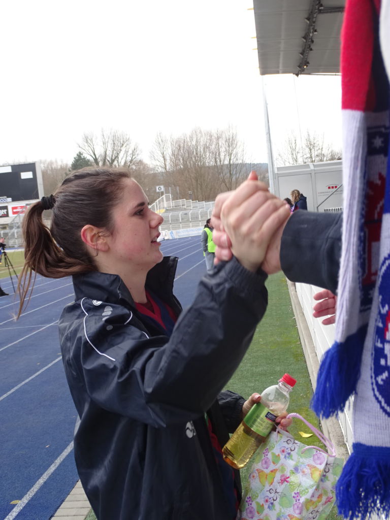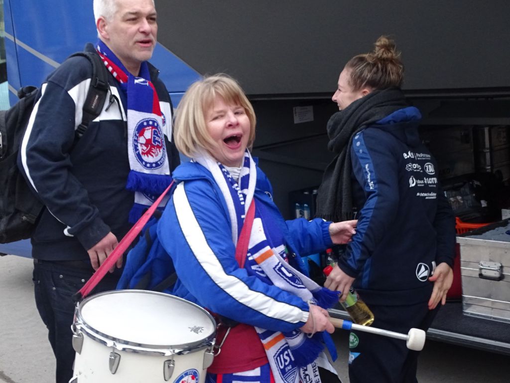 Es gab minderjährige, kleinwüchsige Fans aus Potsdam, die mit einem Trommelschlegel bewaffnet, auf den Allerwertesten von verschiedenen Menschen-Arten (Fans, Spielerinnen und Co-Trainer) einprügelten. Svenja Huth zeigte sich als dankbarste und schlagfertigste Abnehmerin dieser „Prügel-Attacke“.