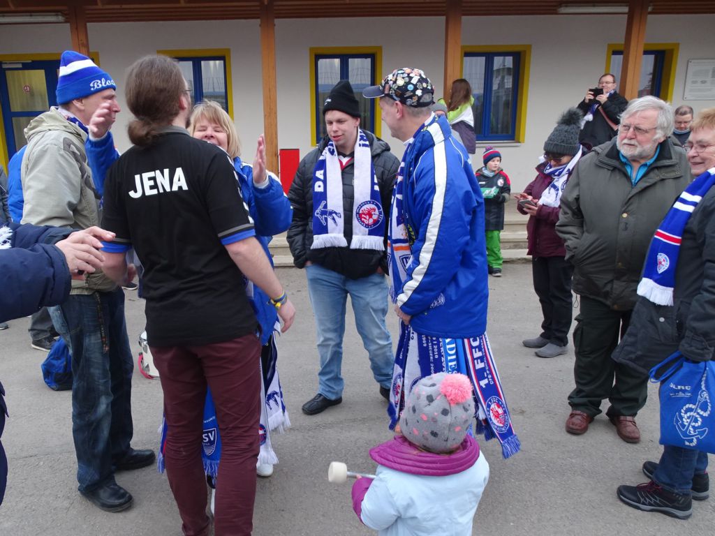 Es war beispielgebend, wie wortreich und warmherzig die Begrüßung der Zuschauer im Ernst-Abbe-Sportfeld zu Jena klang. Warme Worte, wertschätzend gegenüber den allen Fans. Auf die seit vielen Jahren bestehende Fanfreundschaft zwischen beiden Vereinen wurde mehrfach hingewiesen, auch im Stadionheft war davon zu lesen. Der Stadionsprecher erzählte von seinem eigenen Besuch im „Karli“, lobte während der Halbzeitpause die Stimmung auf den Rängen und verabschiedete sich auch am Ende wohlwollend von den Zuschauenden.