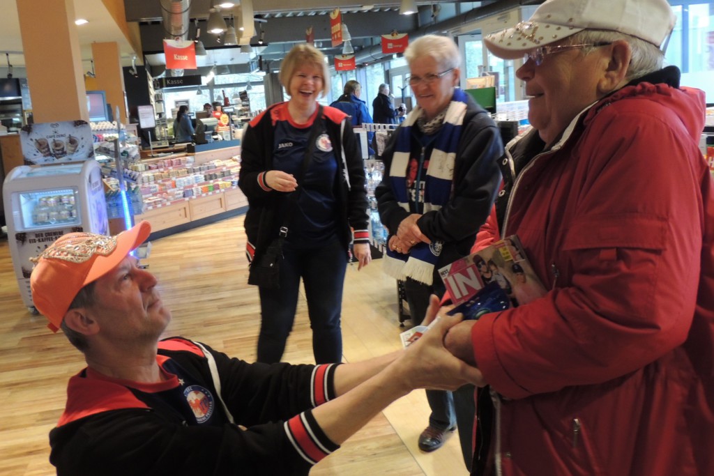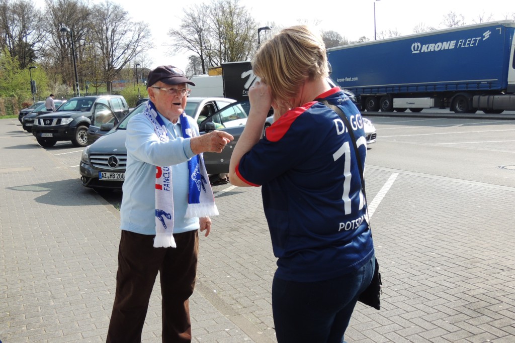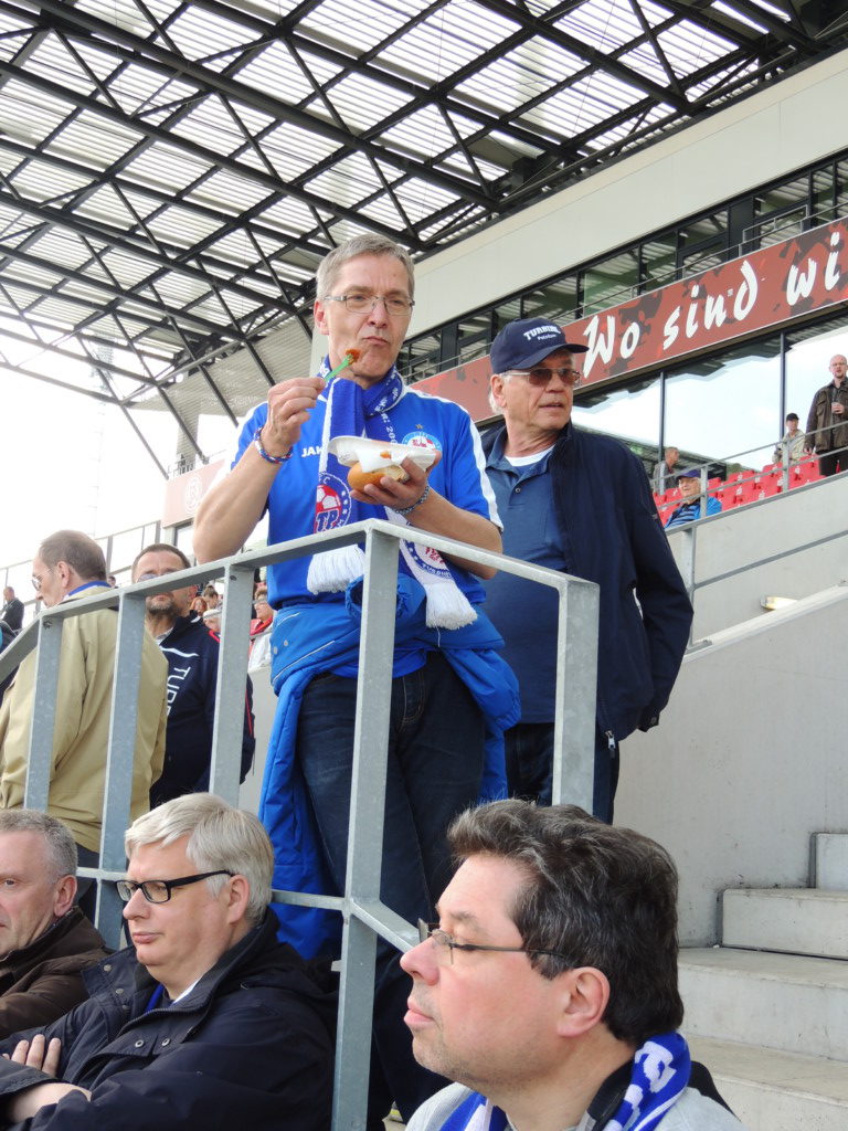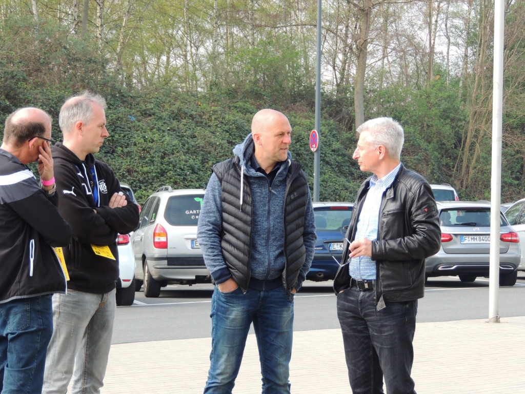 Ebenfalls gern gesehen und an dieser Stelle schreibend begrüßt seien zum einen die drei gesichteten Hoffenheimer Fans, stark bewaffnet und gut hörbar mit XXL-Glocke und Trommel, sowie das Sympathie-Trainierteam des „doppelten Jürgens“, Jürgen Ehrmann und Jürgen Grimm, die während des Spiels auch mal in einen verschmitzten Kurzdialog mit dem Fanblock traten.