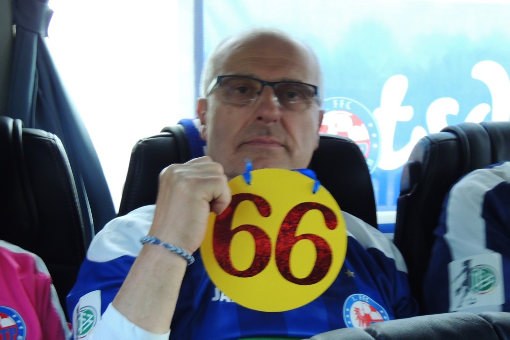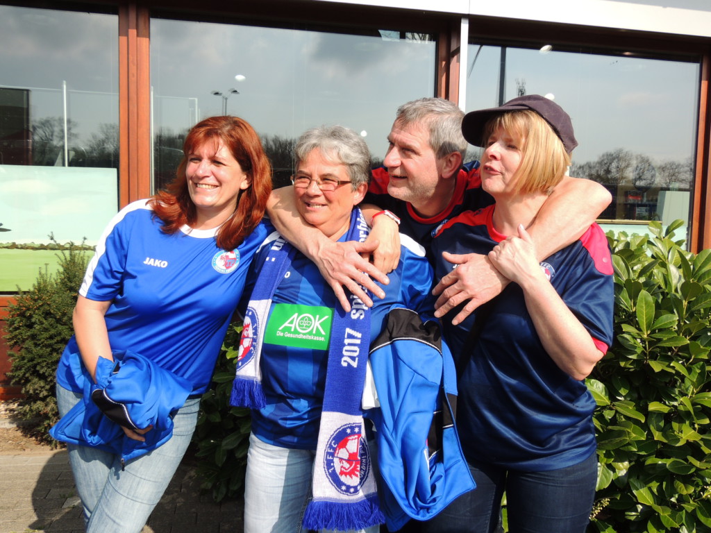 So konnten 8 treue Fans im „kleinen Schwarzen“ (dem Mannschaftsbus der U15) nach Sand reisen. Dank des übergroßen Vereinslogo auf der Karosserie eine Frauenfußballwerbung quer durchs deutsche Land. Am Steuer saß ein souveräner Fahrer namens Peter T., der die ganze Leihauto-Sache eingefädelt hatte. Da 1.500 km an einem Tag zu sportlich sind, startete die Unternehmung bereits am Sonnabend zur Mittagszeit und schloss eine Übernachtung ein.