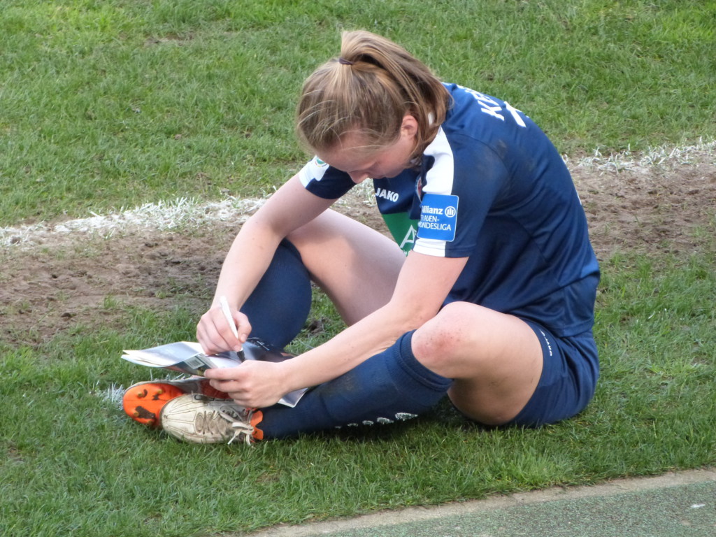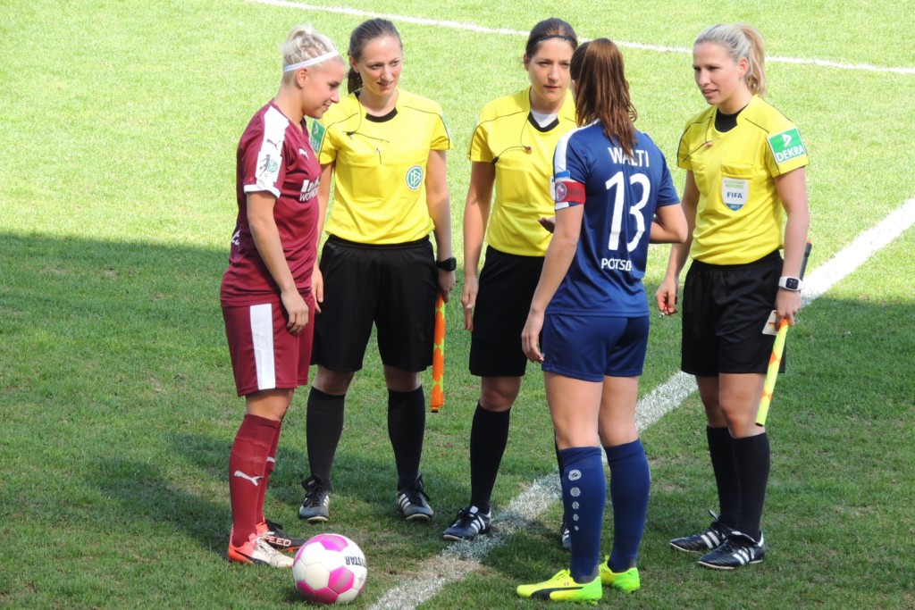Nun aber zum Spiel an sich: Fiebrige Aufgeregtheit, zeitverzögertes Warten auf den Anpfiff – denn das Fernsehen bestimmt, wann der Anpfiff ertönt, und nicht die Schiedsrichterin … Zeit, um die Ehrengäste zu begrüßen: die DFB-Nationaltrainerin Steffi Jones, den Oberbürgermeister Jann Jakobs, den Bildungsminister Günter Baaske.