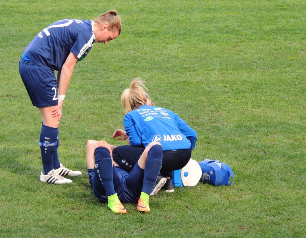 Die erste Halbzeit war auch von Tragik geprägt: Inka Wesely verletzte sich nach wenigen Minuten am Knie, Eseosa Aigbogun fand im Sandner Rasen keinen Freund und musste ebenfalls verletzungsbedingt ausgewechselt werden. Auch bei den Gastgebern gab es eine Spielunterbrechung mit 112-Einsatz, da die künftige Bayern-Spielerin Damnjanovic bewusstlos am Boden liegen blieb. Aber sie konnte erstaunlicher und erfreulicher Weise danach weiterspielen.