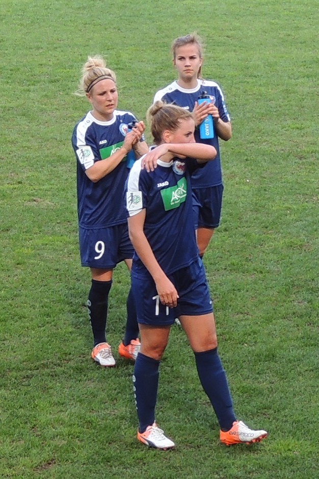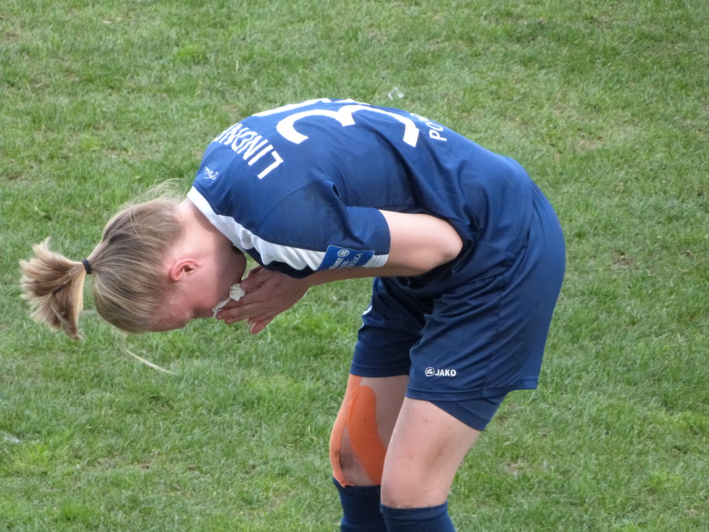 In der 2. Halbzeit folgte eine analoge Wiederholung der Startphase: Wummkrachbumm! Kaum angepfiffen, kommt es in der 48. Minute zu einem „Luller“-Tor – 2:1 für Wolfsburg. Anna Blässe nutzt einen Fehler der Potsdamerinnen gnadenlos aus und steht leider an der richtigen Stelle parat. Ärgerlich, blöd, total doof! Aber Potsdam kämpft weiter, auch wenn dieses Tor einen tieferen Schnitt in die Wunde darstellt.