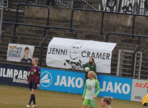 Aber hätte hätte Fahrradkette ! Vielleicht haben sich unsere Turbineladies zu lang mit Jubeln aufgehalten oder dachten sie schon ans Halbfinale ? Köln kam in der Schlußminute nochmal vor’s Turbinetor und Jenny klärte klasse zur Ecke. In deren Verlauf hatte ich den Eindruck, daß in unserer Abwehr die Parole galt: „ich hab in sicher – nimm Du ihn !“. Nun, der 1.FC Köln bedankte sich, gewann das Spiel 2:1 und ging somit als Gruppensieger vom Parkett und unsere Turbinen mussten im Halbfinale gegen den VfL Wolfsburg ran. Ach, warum soll ich es leugnen: auch in dieser Altersklasse ist das für mich nicht irgendein Spiel. Aber gerade bei den Juniorinnen ist für mich Fairness mit den Gegnerinnen oberstes Gebot !