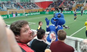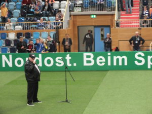 Es gab noch weitere Musikeinlagen: Am zweiten Turniertag wurde die MBS-Arena auf einmal mit „Glück auf, der Steiger kommt“ beschallt und Bernd Schröder, dessen Lieblings- und Verabschiedungslied hier erklang, winkte mild lächelnd aus der VIP-Lounge den Zuschauern zu – und verließ diese kleine Bühne nicht, um z. B. auf den Mittelpunkt der Rasenfläche zu treten. Er hält sein Wort.