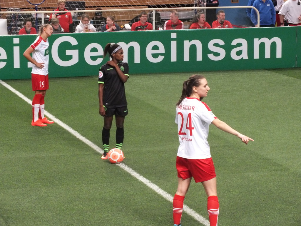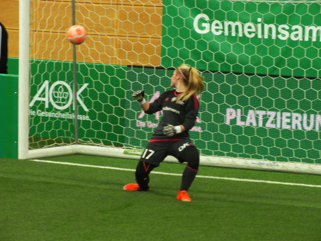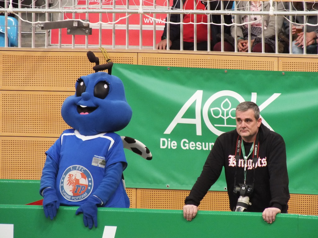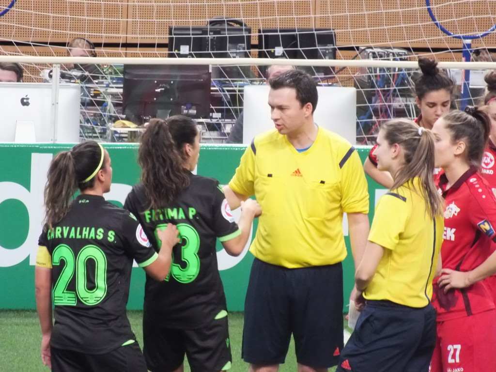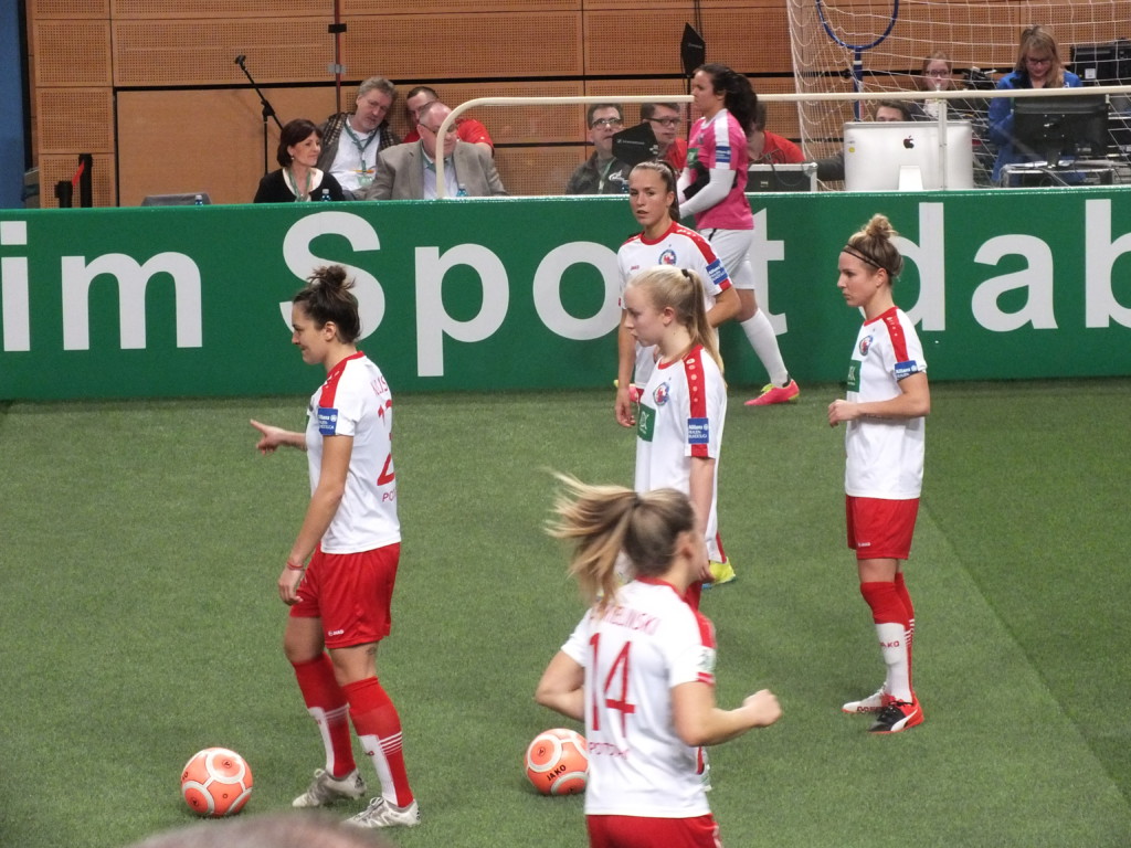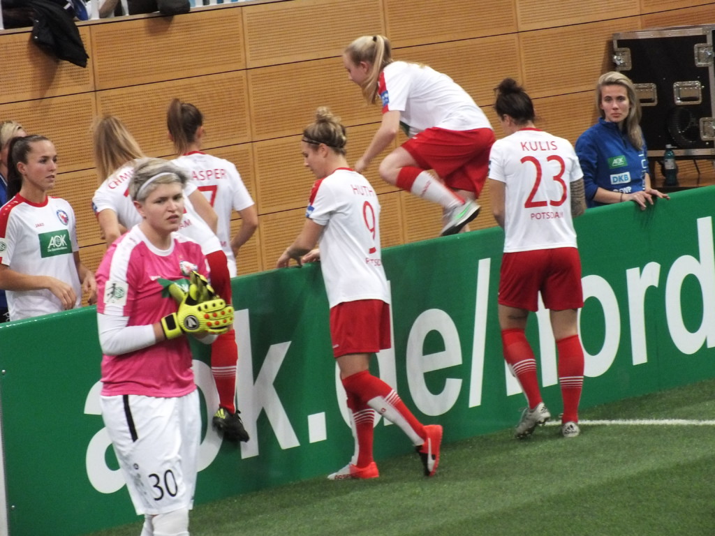 Überraschung Nr.3 war, dass Turbine Potsdam das entscheidende Spiel in der K.O.-Runde nicht verlor;-) Der „Hänger“ wurde in den Sonntagmorgen verlagert, als die Torbienen gegen Sporting Lissabon ihr einziges Spiel innerhalb der Gruppenphase verloren. Ansonsten spielten sie frisch und frei auf und reihten insbesondere am 1. Spieltag des Turniers einen Kantersieg an den anderen. Es war einfach nur erfrischend und begeisternd, den Mädels beim Spiel zuzusehen. Absolute Heimspielatmosphäre! Svenja Huth, die verletzungsbedingt am Finalspiel nicht teilnehmen konnte, dafür aber unter lautstarken „Huth-Huth!“- Rufen einen ins Aus geschossenen Ball hinter der Bande auffing, wurde am Ende als Torschützenkönigin mit 10 Treffern geehrt, was ihre Tränen schnell zu Freudentränen verwandeln ließ. Überraschend auch das spielerische Können der beiden „Küken“, Gina Chmielinski und Caroline Siems, die mit ihren drei Treffern zum 3:1-Sieg im Finale beitrugen und somit nicht den Vogel, sondern den Hallenpokal galant abschossen. Beim Hallenturnier in Jöllenbeck hatten sie sich bereits gut eingespielt, sodass dieses gezeigte Potenzial für die dort anwesenden Turbinefans weniger überraschend erschien. Nett umrandet wurde das „Küken-Können“ durch ein Interview-Video mit der Reporterin Inka Wesely.