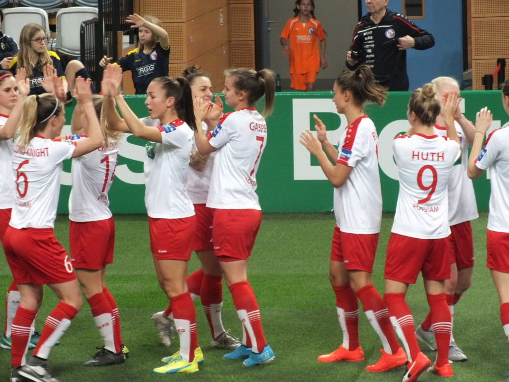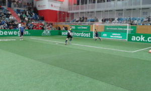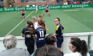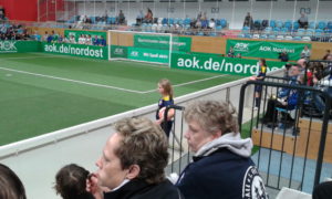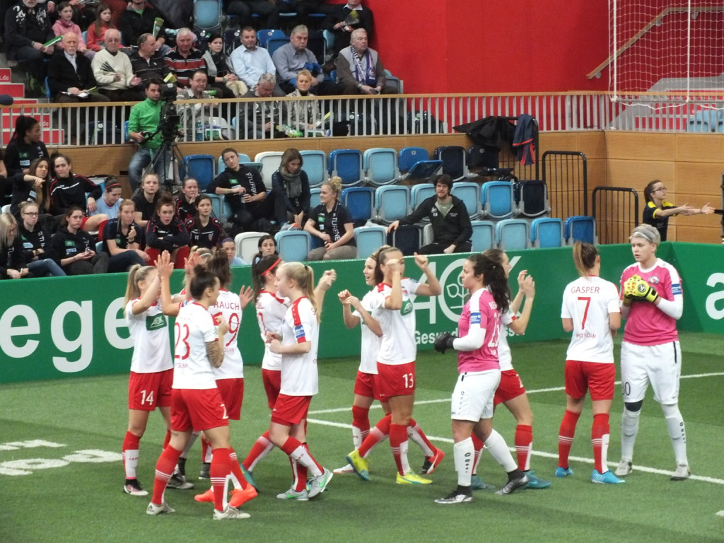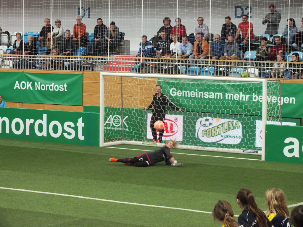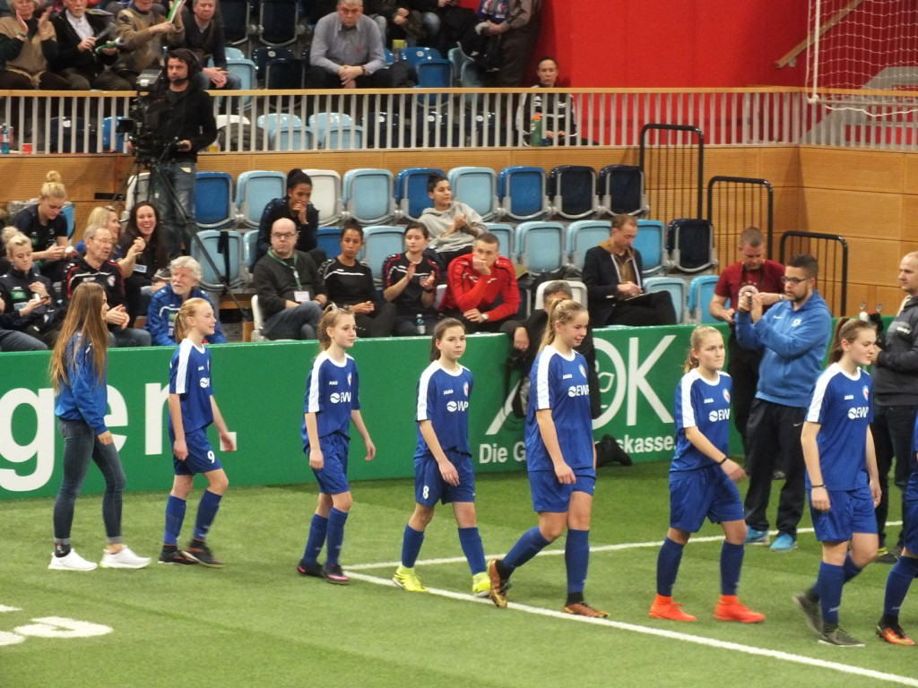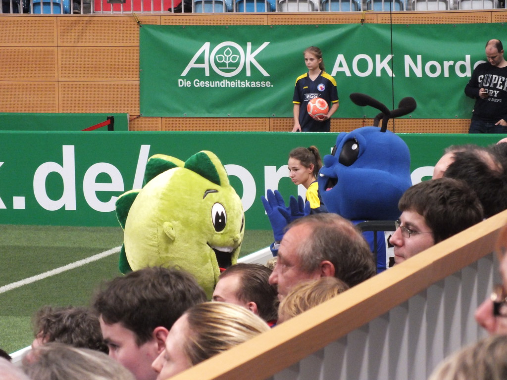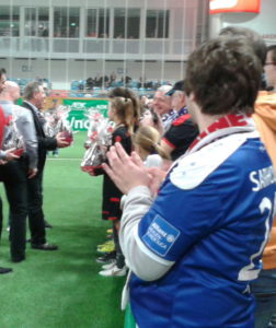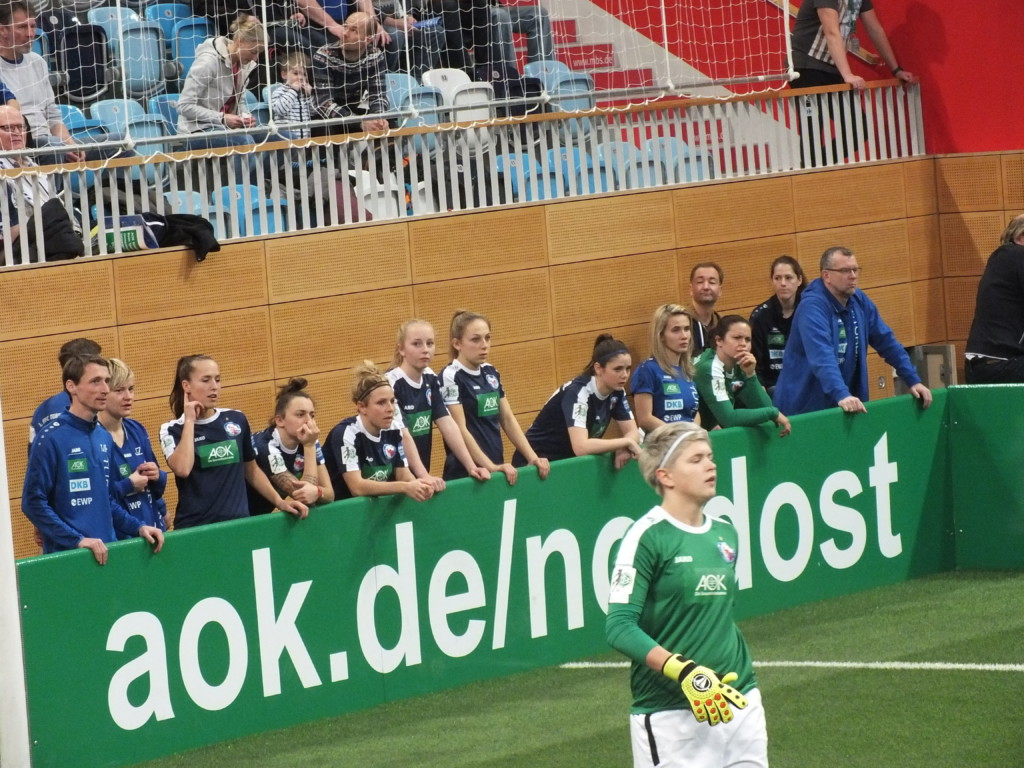 Überraschung Nr.3 war, dass Turbine Potsdam das entscheidende Spiel in der K.O.-Runde nicht verlor;-) Der „Hänger“ wurde in den Sonntagmorgen verlagert, als die Torbienen gegen Sporting Lissabon ihr einziges Spiel innerhalb der Gruppenphase verloren. Ansonsten spielten sie frisch und frei auf und reihten insbesondere am 1. Spieltag des Turniers einen Kantersieg an den anderen. Es war einfach nur erfrischend und begeisternd, den Mädels beim Spiel zuzusehen. Absolute Heimspielatmosphäre! Svenja Huth, die verletzungsbedingt am Finalspiel nicht teilnehmen konnte, dafür aber unter lautstarken „Huth-Huth!“- Rufen einen ins Aus geschossenen Ball hinter der Bande auffing, wurde am Ende als Torschützenkönigin mit 10 Treffern geehrt, was ihre Tränen schnell zu Freudentränen verwandeln ließ. Überraschend auch das spielerische Können der beiden „Küken“, Gina Chmielinski und Caroline Siems, die mit ihren drei Treffern zum 3:1-Sieg im Finale beitrugen und somit nicht den Vogel, sondern den Hallenpokal galant abschossen. Beim Hallenturnier in Jöllenbeck hatten sie sich bereits gut eingespielt, sodass dieses gezeigte Potenzial für die dort anwesenden Turbinefans weniger überraschend erschien. Nett umrandet wurde das „Küken-Können“ durch ein Interview-Video mit der Reporterin Inka Wesely.