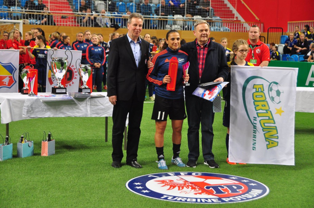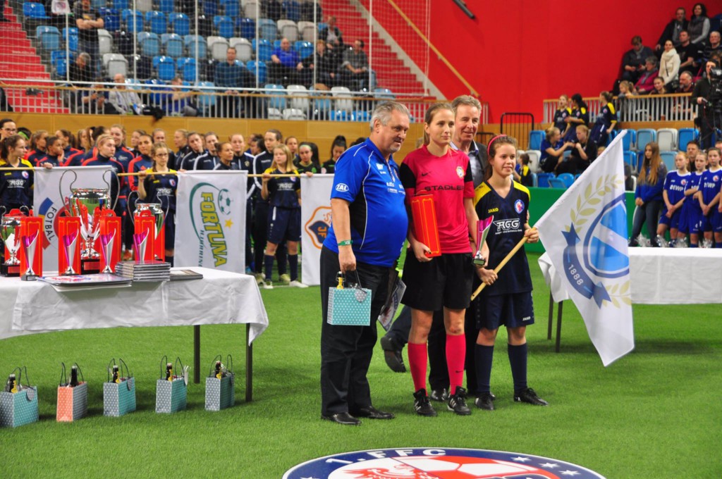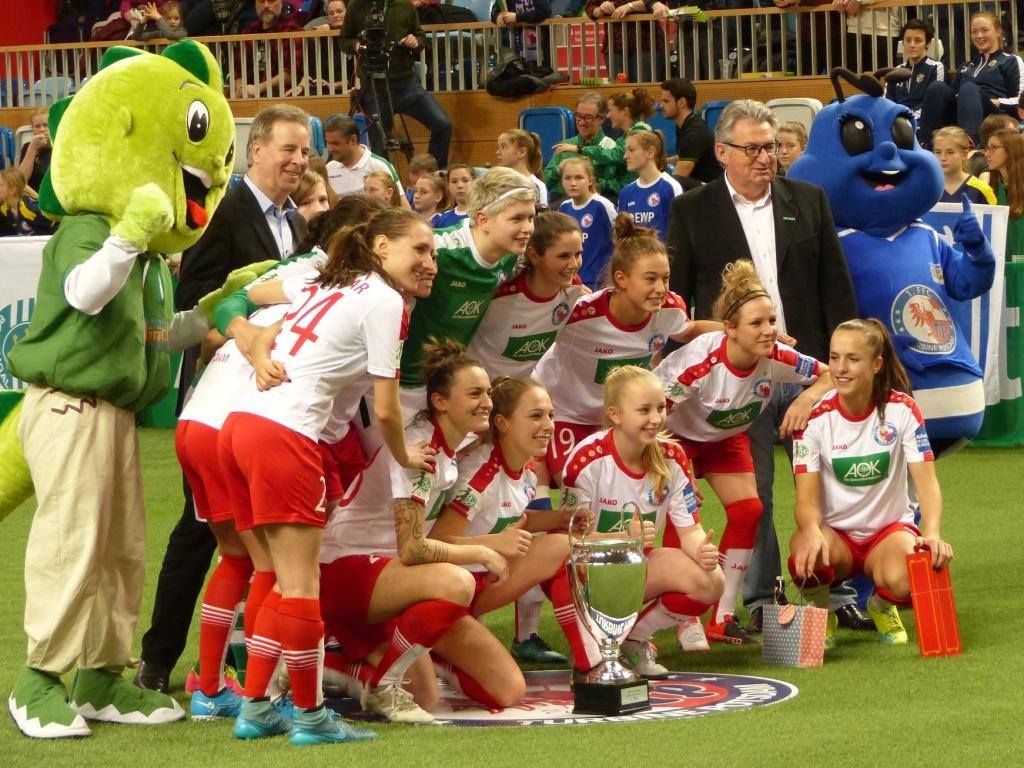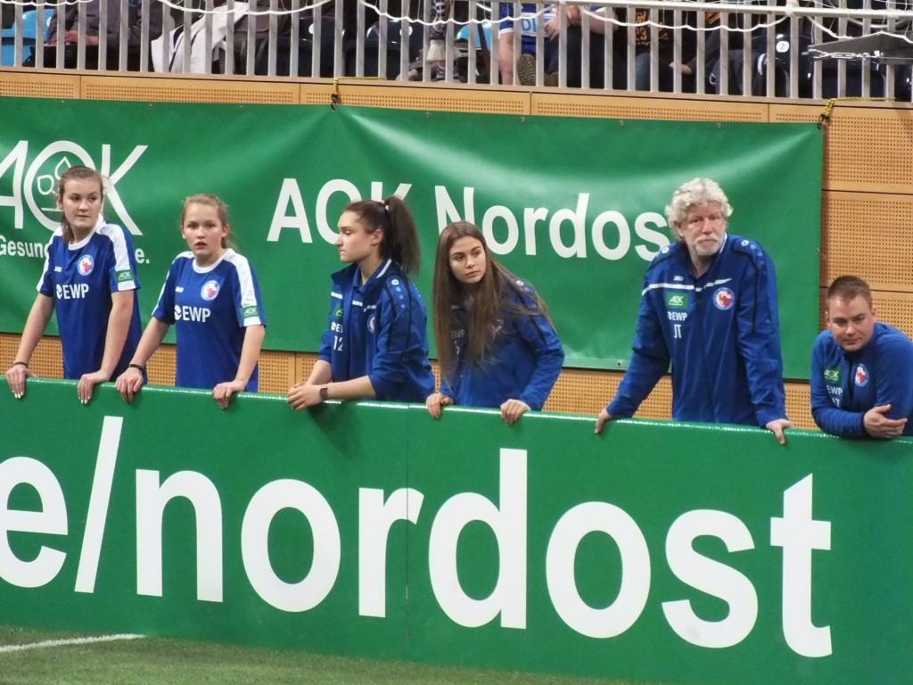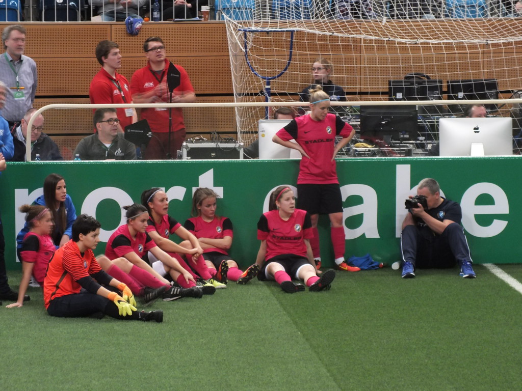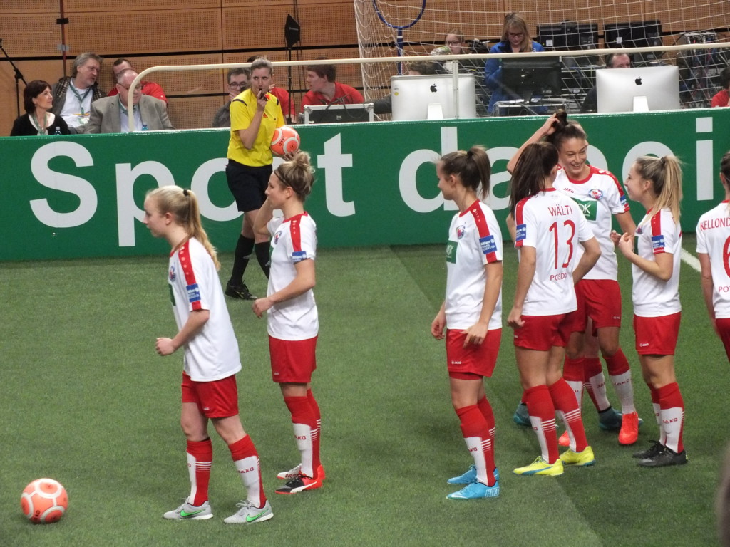 Überraschung Nr.3 war, dass Turbine Potsdam das entscheidende Spiel in der K.O.-Runde nicht verlor;-) Der „Hänger“ wurde in den Sonntagmorgen verlagert, als die Torbienen gegen Sporting Lissabon ihr einziges Spiel innerhalb der Gruppenphase verloren. Ansonsten spielten sie frisch und frei auf und reihten insbesondere am 1. Spieltag des Turniers einen Kantersieg an den anderen. Es war einfach nur erfrischend und begeisternd, den Mädels beim Spiel zuzusehen. Absolute Heimspielatmosphäre! Svenja Huth, die verletzungsbedingt am Finalspiel nicht teilnehmen konnte, dafür aber unter lautstarken „Huth-Huth!“- Rufen einen ins Aus geschossenen Ball hinter der Bande auffing, wurde am Ende als Torschützenkönigin mit 10 Treffern geehrt, was ihre Tränen schnell zu Freudentränen verwandeln ließ. Überraschend auch das spielerische Können der beiden „Küken“, Gina Chmielinski und Caroline Siems, die mit ihren drei Treffern zum 3:1-Sieg im Finale beitrugen und somit nicht den Vogel, sondern den Hallenpokal galant abschossen. Beim Hallenturnier in Jöllenbeck hatten sie sich bereits gut eingespielt, sodass dieses gezeigte Potenzial für die dort anwesenden Turbinefans weniger überraschend erschien. Nett umrandet wurde das „Küken-Können“ durch ein Interview-Video mit der Reporterin Inka Wesely.