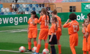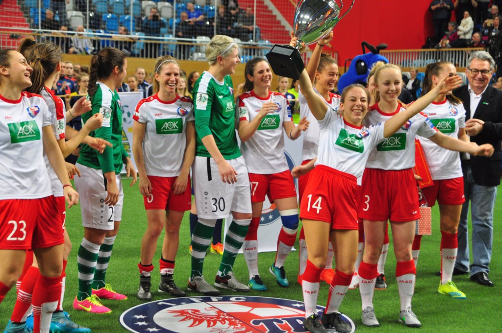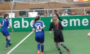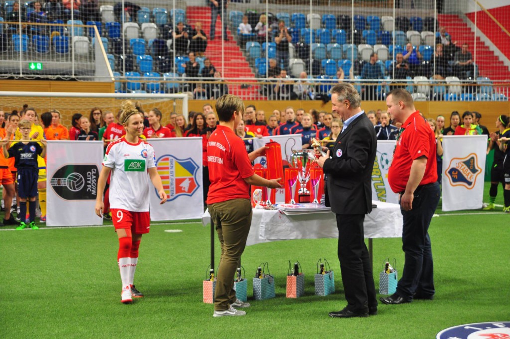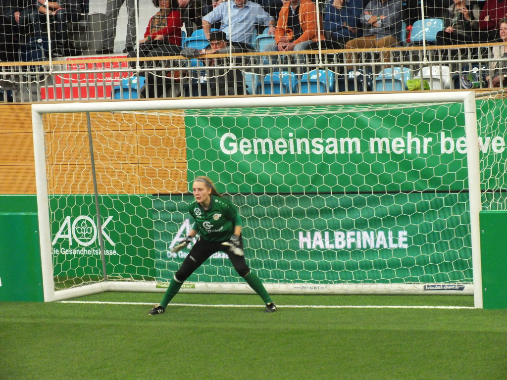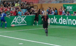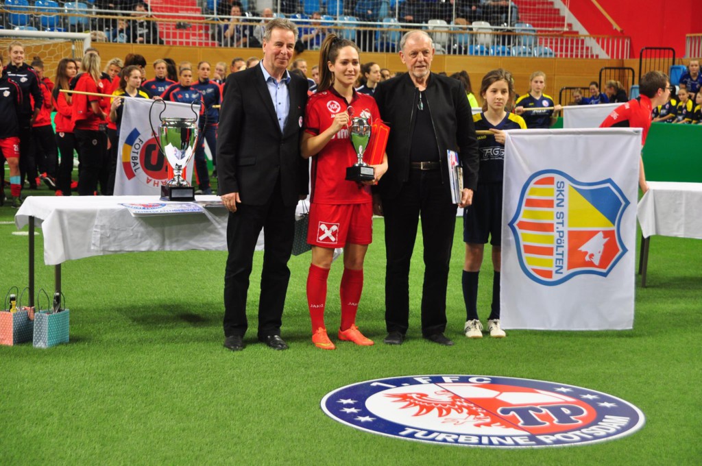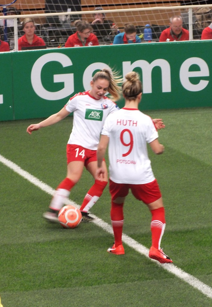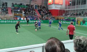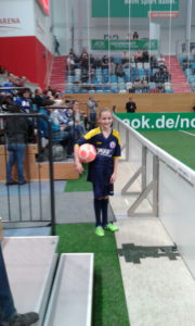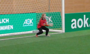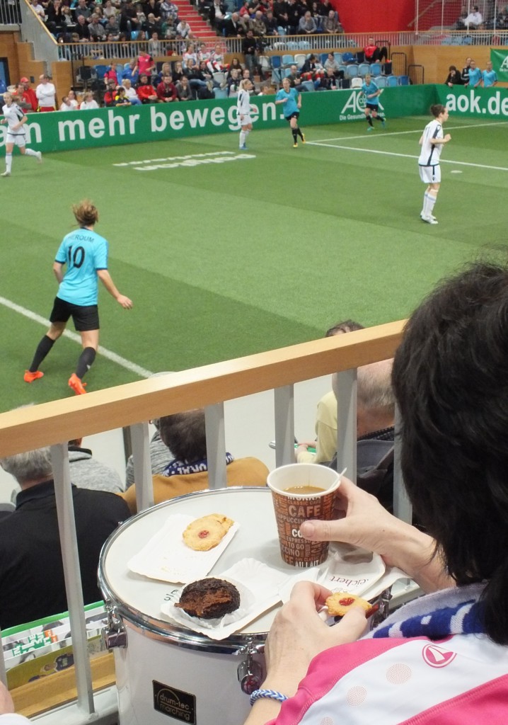 Überraschung Nr.3 war, dass Turbine Potsdam das entscheidende Spiel in der K.O.-Runde nicht verlor;-) Der „Hänger“ wurde in den Sonntagmorgen verlagert, als die Torbienen gegen Sporting Lissabon ihr einziges Spiel innerhalb der Gruppenphase verloren. Ansonsten spielten sie frisch und frei auf und reihten insbesondere am 1. Spieltag des Turniers einen Kantersieg an den anderen. Es war einfach nur erfrischend und begeisternd, den Mädels beim Spiel zuzusehen. Absolute Heimspielatmosphäre! Svenja Huth, die verletzungsbedingt am Finalspiel nicht teilnehmen konnte, dafür aber unter lautstarken „Huth-Huth!“- Rufen einen ins Aus geschossenen Ball hinter der Bande auffing, wurde am Ende als Torschützenkönigin mit 10 Treffern geehrt, was ihre Tränen schnell zu Freudentränen verwandeln ließ. Überraschend auch das spielerische Können der beiden „Küken“, Gina Chmielinski und Caroline Siems, die mit ihren drei Treffern zum 3:1-Sieg im Finale beitrugen und somit nicht den Vogel, sondern den Hallenpokal galant abschossen. Beim Hallenturnier in Jöllenbeck hatten sie sich bereits gut eingespielt, sodass dieses gezeigte Potenzial für die dort anwesenden Turbinefans weniger überraschend erschien. Nett umrandet wurde das „Küken-Können“ durch ein Interview-Video mit der Reporterin Inka Wesely.