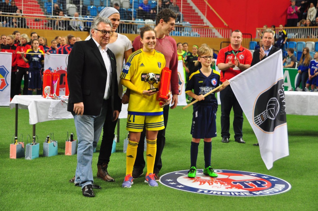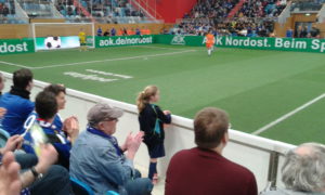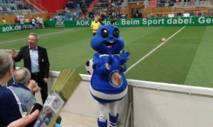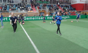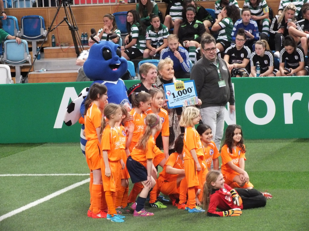 Ein Fokus lag auf dem Turbine-Nachwuchs. Neben dem Turbinchen-Maskottchen, das sich im wahrsten Sinne des Wortes einen „Wander-Pokal“ verdient hätte, weil es unermüdlich die Fan- und Spielerränge hoch- und runterlief und mit seinem Patschehändchen abklatschte, was abgeklatscht werden wollte, wurde den anderen „Turbinchen“, also dem einheimischen Nachwuchs, ein großes Augenmerk geschenkt. Hier wurde feierlich eine 1000€-Spende seitens des „Heim Deko“- Sponsors übergeben. Die Mädchen sorgten für eine Pauseneinlage, und der U15-Nachwuchs durfte vor dem Finalspiel gegen die U15 vom 1. FC Union Berlin antreten – und gekonnt 3:0 gewinnen.