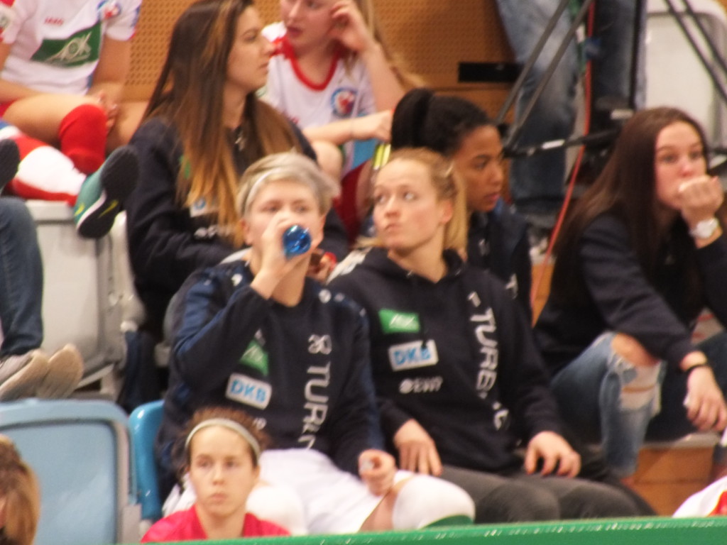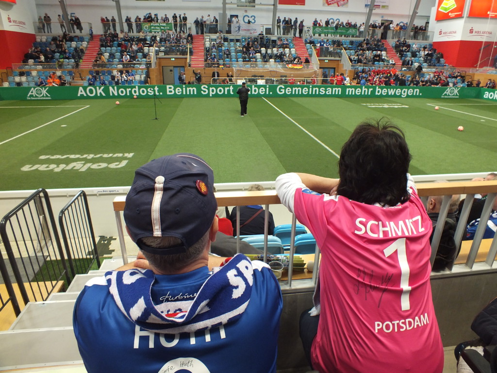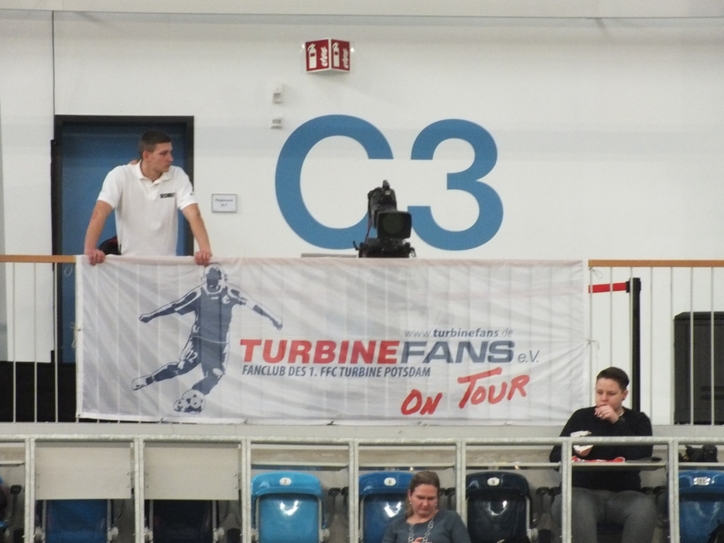 Und dann natürlich das Publikum – einfach unglaublich! Wer die MBS-Arena zu anderen sportlichen Anlässen besucht, z. B. den Volleyball-Damen vom SC Potsdam oder den „Bumbaye“-Handballern vom Vfl Potsdam zuschaut, wird eingestehen müssen, das dort ganz nette Stimmung herrscht, aber eben nicht diese einzigartige Hallencup-Stimmung. Der Fanblock gab sein Allerbestes – und der große Rest der Zuschauer zog begeistert mit. Unvergleichbar mit dem Block C im „Karli“, der sich häufig nicht vom Fanblock D anstecken lässt. Und genau diese Fanbegeisterung und Frauenfußballfreude schätzen die internationalen Gäste. Besondere Bestätigung liefern jedes Jahr die Neulinge des Teilnehmerfeldes ab. Diesmal war Sporting Lissabon fast sprachlos, welche Emotionen der Frauenfußball auslösen kann. Der Trainer kam am Ende des Turniers dankend gestikulierend auf die Fans zugerannt, die Mannschaft ließ sich vor dem Fanblock fotografieren und die portugiesischen Spielerinnen wickelten sich begeistert in Turbine-Fanschals ein.