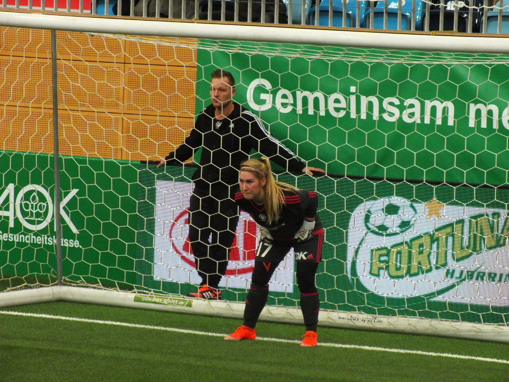 Auch andere Sponsoren sorgten für Unterhaltung abseits des Spielgeschehens. Die Confiserie Reichert aus Berlin präsentierte verschiedene Leckerlis, u.a. eine Foto-Torte, und beteiligte sich in unübersehbaren süßem Maße an der Siegerehrung. Bei der Allianz konnte man Kicker spielen und der Fanshop war mit dem gesamten Fanartikel-Angebot am Start. Am Abend des 1. Spieltages gab es wieder die ultimative Lasershow seitens des Filmparks Babelsberg und für die musikalische Pausenunterhaltung am 2. Spieltag sorgte ein Joe Cocker-Doubles namens Mr. Pete, gesponsert von der Business Bau GmbH. Diesem Mr. Pete, der sich mehrfach beim Publikums bedankte, das er hier sein durfte, gelang es Ballade für Ballade immer besser, das Begeisterungstempo des Turniers herauszunehmen (Ironie aus.) Seine Stimme stimmte – aber der Rest riss nicht vom Hocker. Oder doch? Immer mehr Fans standen von ihren Plätzen auf, um anderen Dingen nachzugehen. Vielleicht sollte sich der gastgebende Verein fürs nächste Mal tatsächlich mit dem Gedanken tragen, die Leverkusener Spielerin Rachel Rinast für die musikalische Pausenunterhaltung einzuladen. Jedenfalls gelang es dieser, beim Weltklasse-Hallenturnier in Jöllenbeck binnen 20 Sekunden das Publikum mit ihrem Gesangstalent, das sie vorher in der Castingshow „The Voice“ zum Besten gegeben hatte, mitzureißen. Und wann trifft schon mal ein Fußball- und Musiktalent in einer Person aufeinander? Eher selten. Na ja, Yuki Nagsato konnte blendend Klavier spielen.