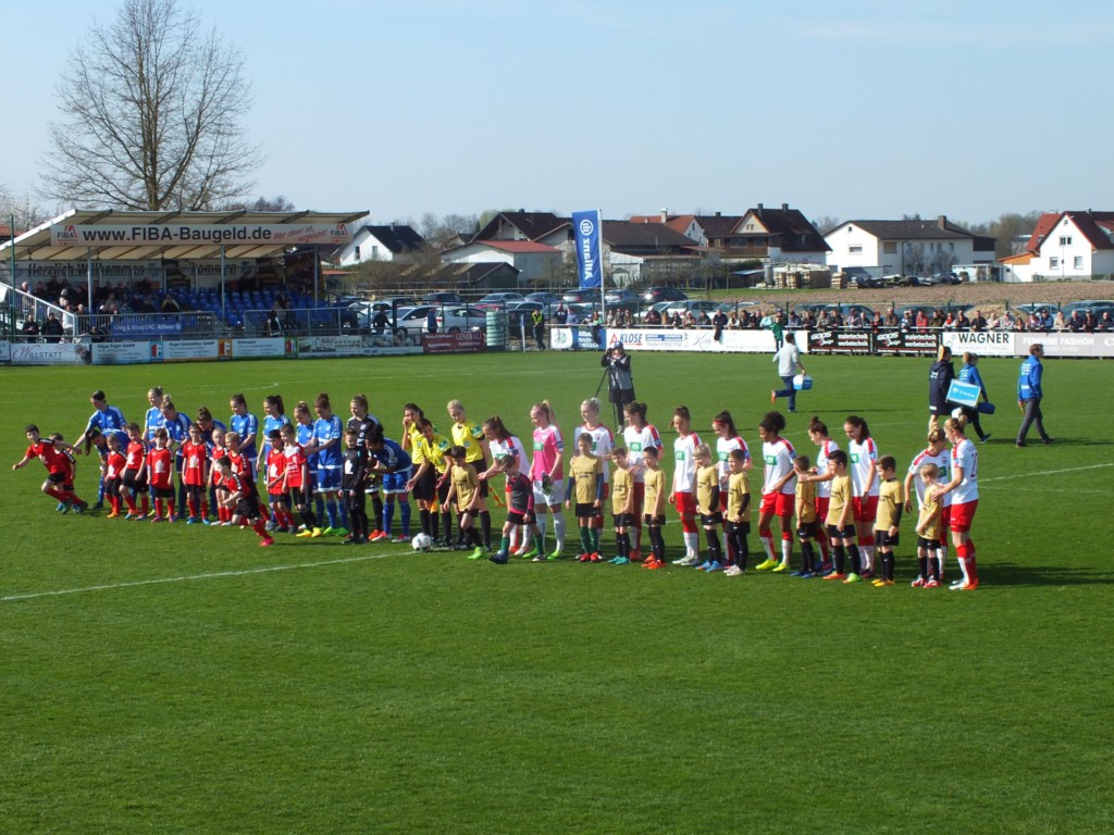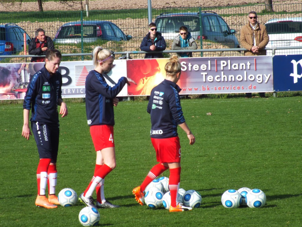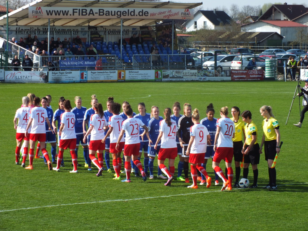 Nach einem ausgeprägten Plausch beider Trainer liefen die Mannschaften auf, begleitet von Eskorte-Kindern einer regionalen F-Jugend, eines davon mit Gipsbein und eines mit ADHS-Symptom. Anstoß hatte Svenja Huth, der Ball rollte und knallte mal an den einen, mal an den anderen Torpfosten. Ein genial gedachter Huth-Lupfer kullerte zum gefühlten 0:1 ins gegnerische Tor, um dann doch noch überraschend auf der Torlinie von einer Sandner Spielerin abgewehrt zu werden.