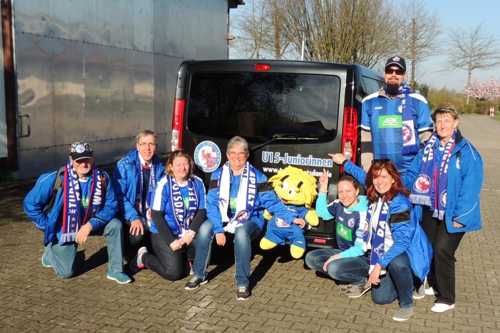 So konnten 8 treue Fans im „kleinen Schwarzen“ (dem Mannschaftsbus der U15) nach Sand reisen. Dank des übergroßen Vereinslogo auf der Karosserie eine Frauenfußballwerbung quer durchs deutsche Land. Am Steuer saß ein souveräner Fahrer namens Peter T., der die ganze Leihauto-Sache eingefädelt hatte. Da 1.500 km an einem Tag zu sportlich sind, startete die Unternehmung bereits am Sonnabend zur Mittagszeit und schloss eine Übernachtung ein.