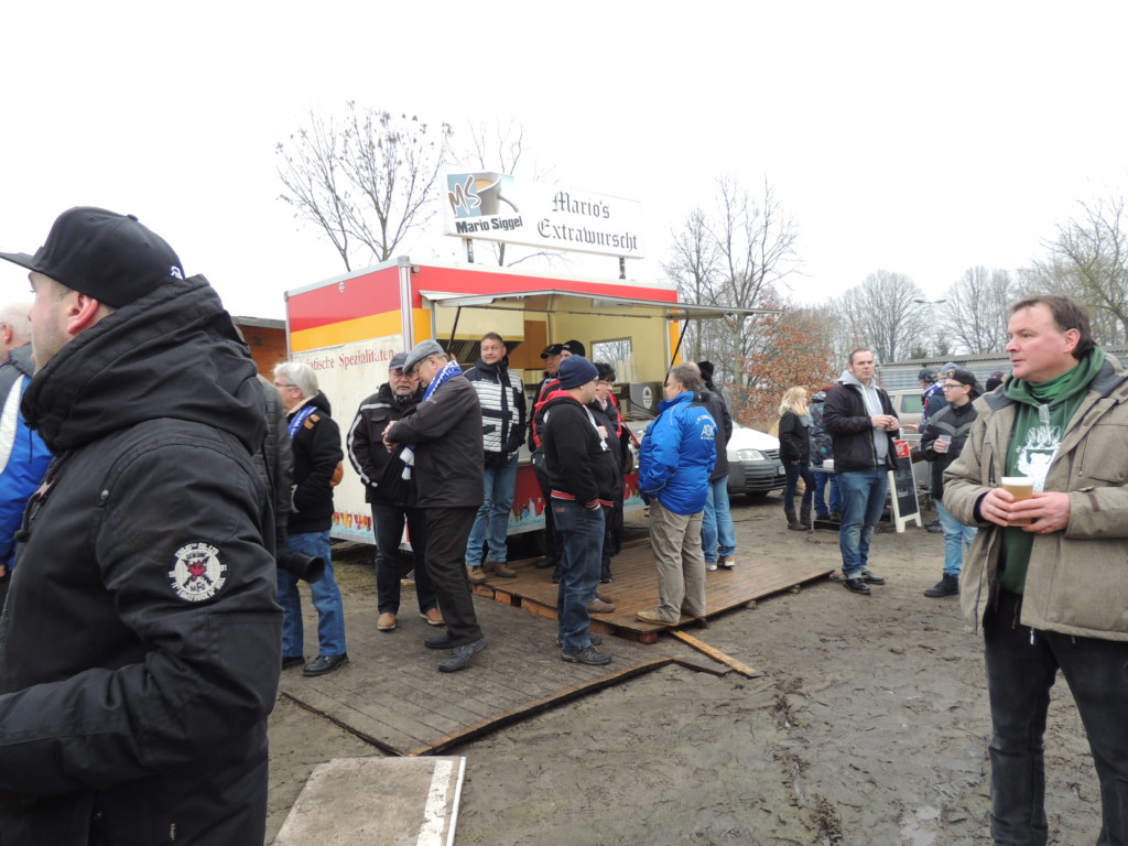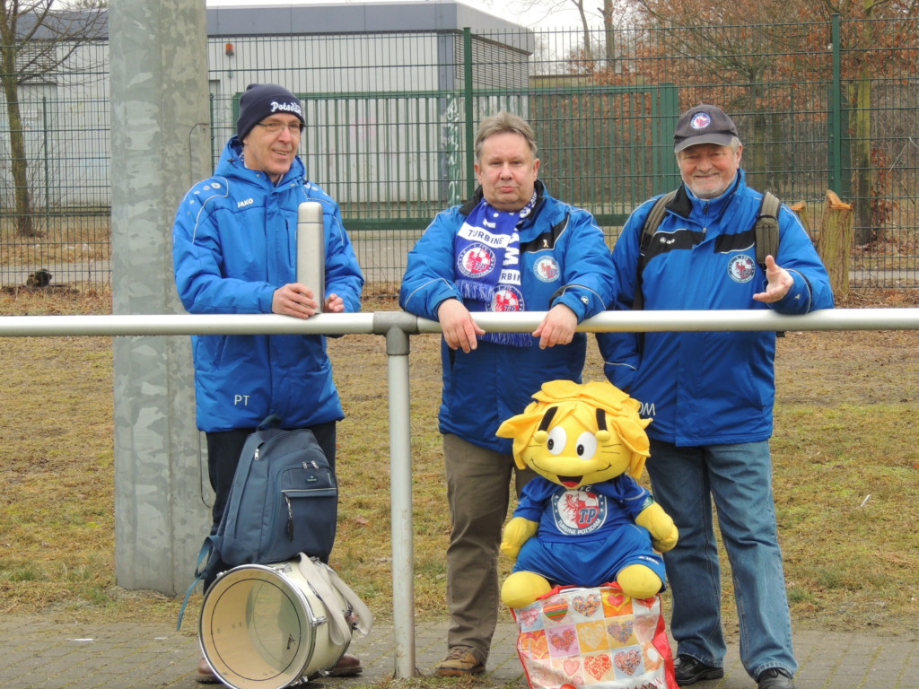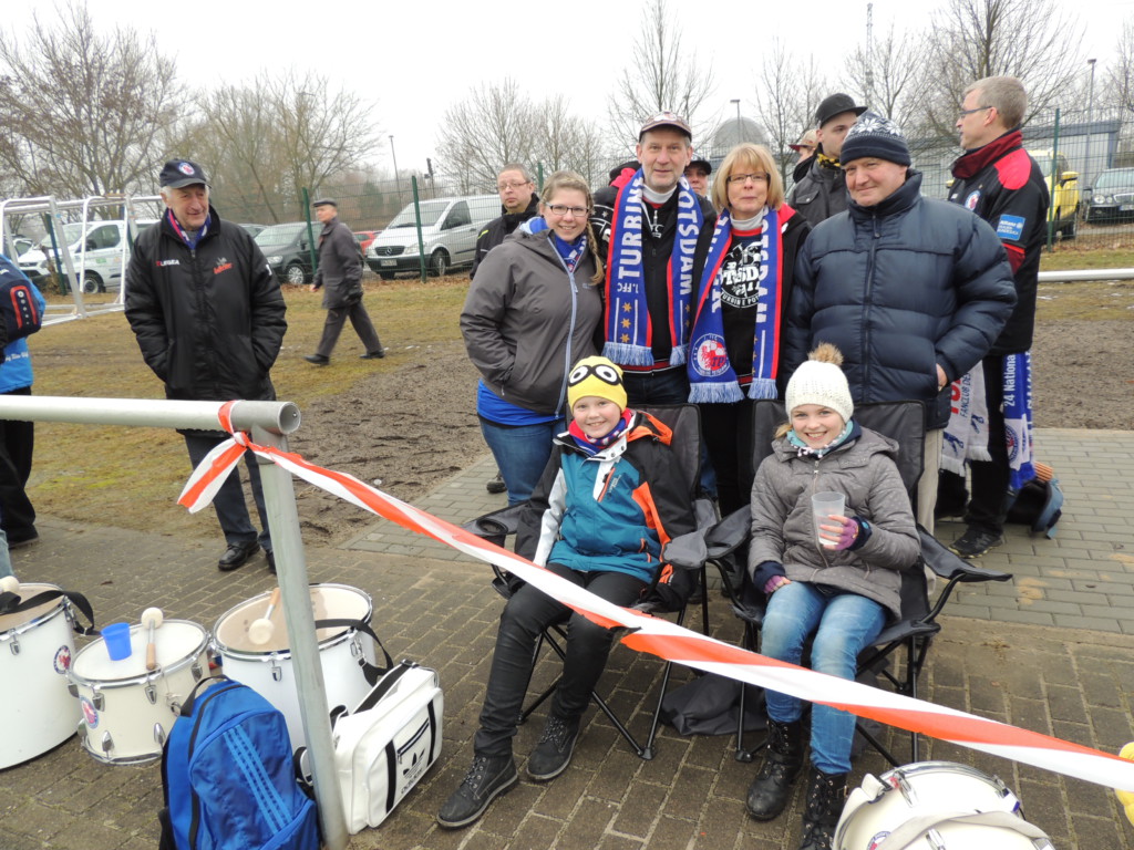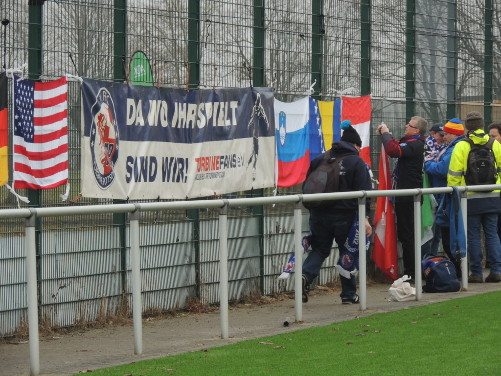 Überall in den Medien groß angekündigt: Das TOP-Testspiel zwischen dem 1.FFC Turbine Potsdam und den Manchester City Women. Kurzfristig musste der Spielort verlegt werden, da der Platz in Velten nicht bespielbar war. Nun fuhr alles nach Oranienburg (für viele leichter erreichbar). Oraflor-Arena, Kunstrasenplatz, aber in etwa wie der Sportplatz in Golm oder Treuenbrietzen, durch das Tauwetter waren die Wege sehr matschig, die Verpflegung improvisiert (zu wenig fertig gegrillte Würste, man stand und stand und stand …) Glühwein gab es in turbineblauen Zahnputzbechern, Kaffee in schlanken, festen Plastikbechern (die gut in die Tablettlöcher des Fanbusses passen würden) und Bier (passte zur Umgebungstemperatur). Aber all das war nebensächlich, es ging ja ums TOP-Spiel!