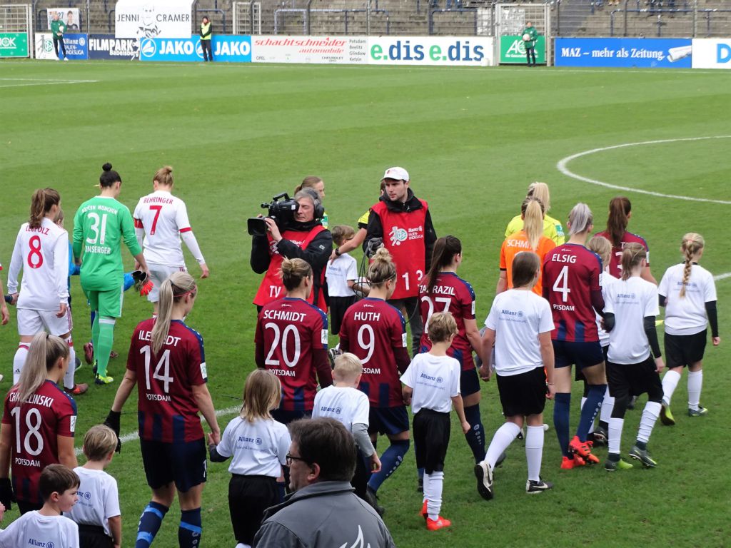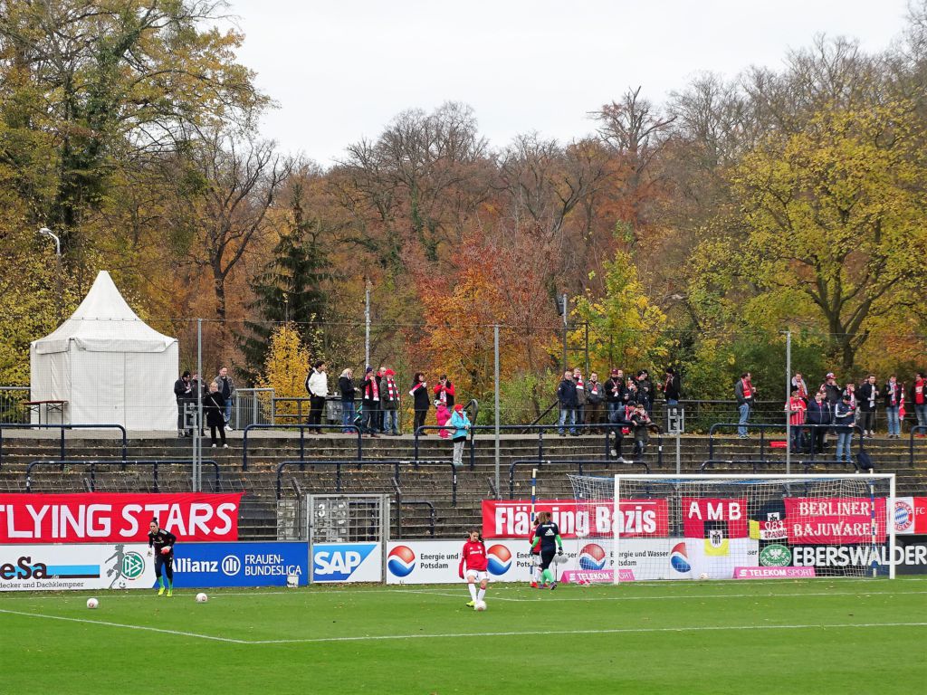 Grau-trübes Sonntagswetter, kühle 7 Grad, Glühwein-Angebot für 3€. Blaue Fahnen flattern auf der Stehtribünenseite im Novemberwind, das Turbinchen-Maskottchen trottet über den Rasen. Die Fernsehkameras stehen bereit, vom RBB und vonTelekom Sport. Es ist 13.35 Uhr – eine ungewöhnliche Anstoßzweit für das Spitzenspiel zwischen Potsdam und München, eine Idee der Fernsehsender.