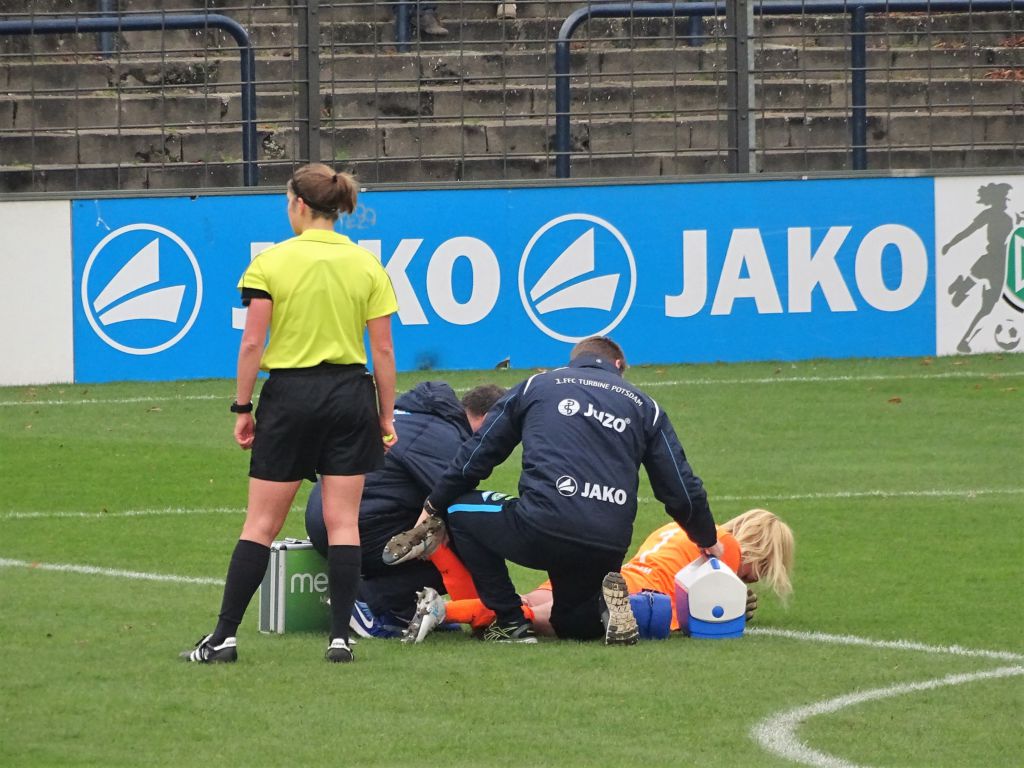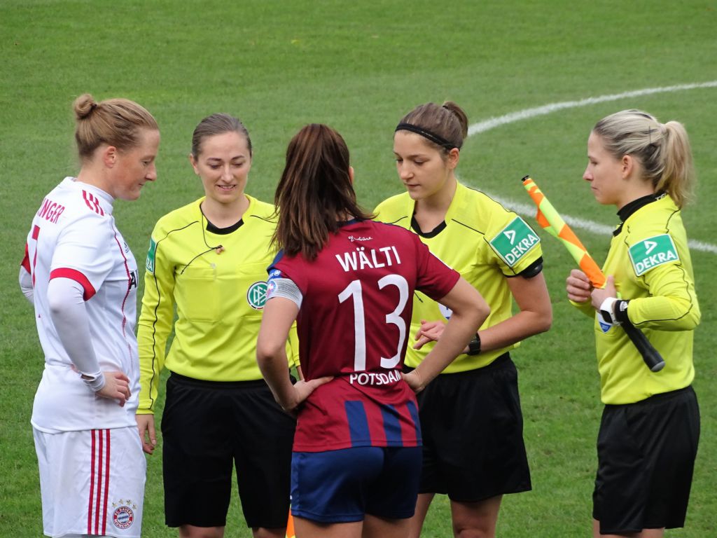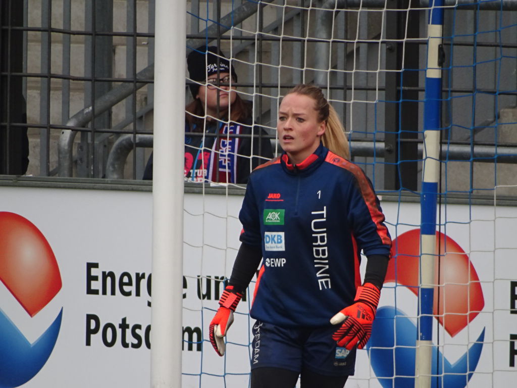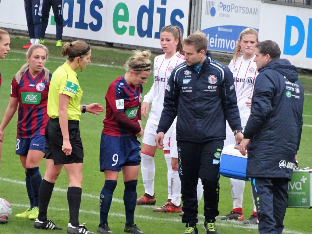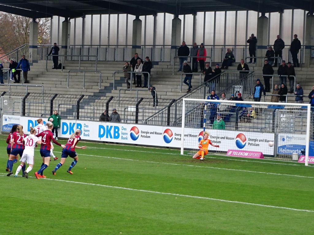 Eine Pfostenknaller-Antwort wenige Minuten später durch Tabea Kemme ließ den Potsdamer Trotz etwas erahnen, der sich ab der 20. Minute zu entwickeln begann. Die Potsdamerinnen fanden nun zunehmend besser ins Spiel, nahmen die Zweikämpfe gezielter an und standen im Mittelfeld besser.