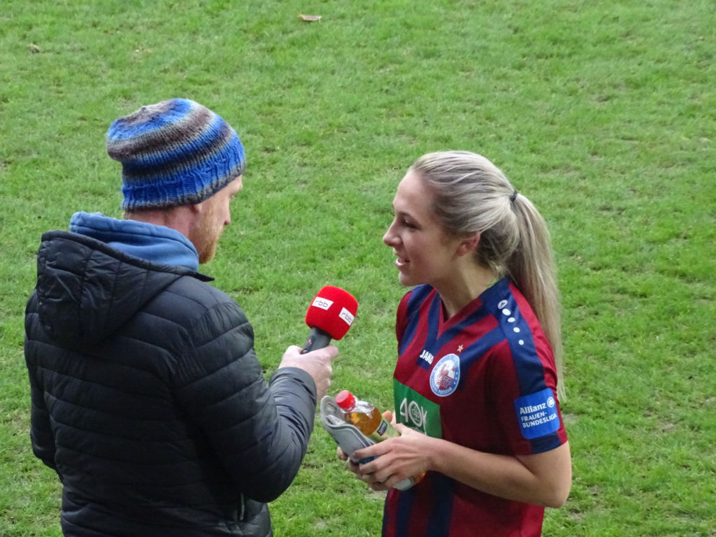 Sie präsentierte im Interview souveräne Äußerungen vor der Kamera, denen man gern lauschte. Dank an dieser Stelle auch dem RBB für die mediale Gestaltung der Halbzeitpause. Auf anderweitige Verbraucher- oder Programmhinweise wurde verzichtet, die gesamte 15-minütige Sendezeit wurde für Informationen rund um den Potsdamer Frauenfußball genutzt: für ein Interview mit Wibke Meister und Matthias Rudolph (Aufzeichnung), für die Analyse von Spielszenen aus der 1. Halbzeit sowie für den filmischen (Rück-) Blick auf die Nationalspielerinnen Tabea Kemme und Svenja Huth. Somit wurde der besondere Charakter des Frauenfußballs bedient, nämlich der totale Fokus auf den Sport an sich.