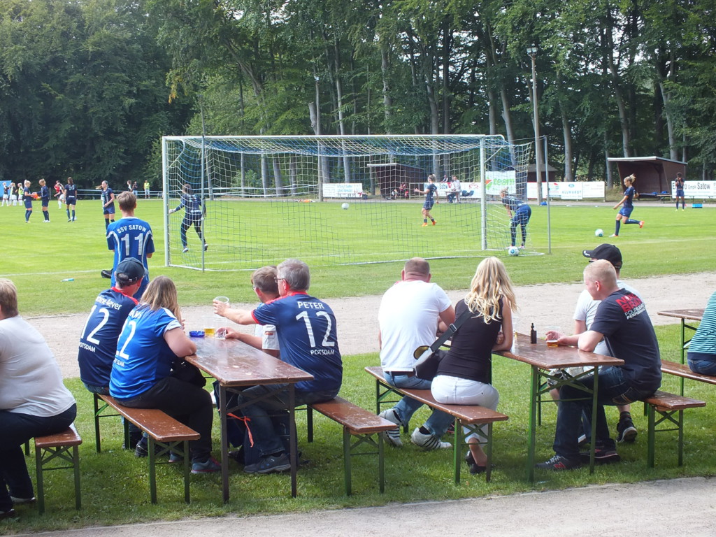 Nach der Begrüßung der Mannschaften und Schiedsrichter mit saftigen Satower Präsentkörben wurde das Spiel angepfiffen. Trotz kurzfristiger Spielortverlegung waren neben den ca. 80-100 Turbinefans auch viele einheimische Zuschauer vor Ort. Nach eröffnenden, euphorischen Anfeuerungsrufen und einer ersten Torchance für Turbine verebbte alsbald der Fangesang. Es gab nichts zu sehen, was Begeisterung auslöste.