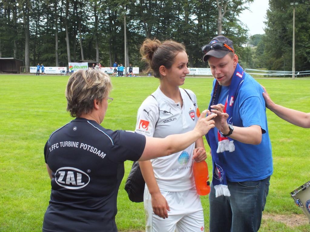 Das Publikum und klatschte erst wieder anerkennenden Beifall, als das erste (und einzige) Tor für die Schwedinnen fiel. Mehr passierte in der 1. Halbzeit nicht. Die Gäste, die bereits inmitten der Meisterschaft stecken, zeigten sich gut eingespielt und mit dem entsprechenden Drang nach vorn. Im Angriff wie auch im Rückzug waren sie einen Tick schneller und wirkten mannschaftlich geschlossen. Die Potsdamerinnen spielten dagegen in der ersten Halbzeit ohne Mittelfeld und initiierten häufig verpuffende Angriffe. Positiv fiel jedoch auf, dass nicht nur das schwedische Team miteinander reden konnte. Die Qualität der Rasenkommunikation ist nun auch bei Turbine gut zu hören.