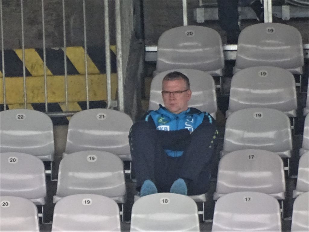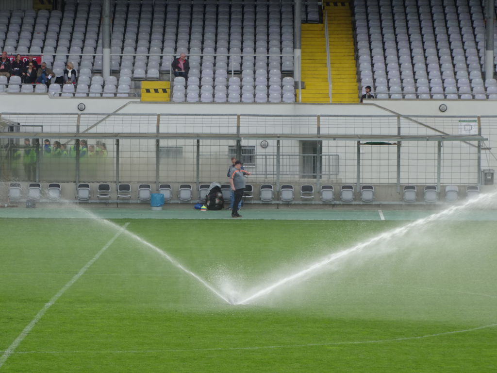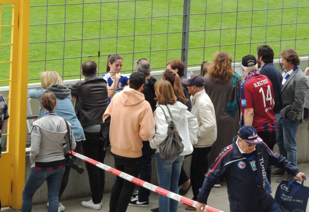 Wie dem auch sei – der Optimismus wurde trotz Maskottchenverlust gewahrt. Mit reduzierter Fan-Equipment-Ausstattung war der Blick nun aufs Spielfeld gerichtet, nachdem beide Mannschaften brav die leere Haupttribüne angewunken hatten und ein „Rückenfoto“ für Fernsehen und Presse geschossen wurde.