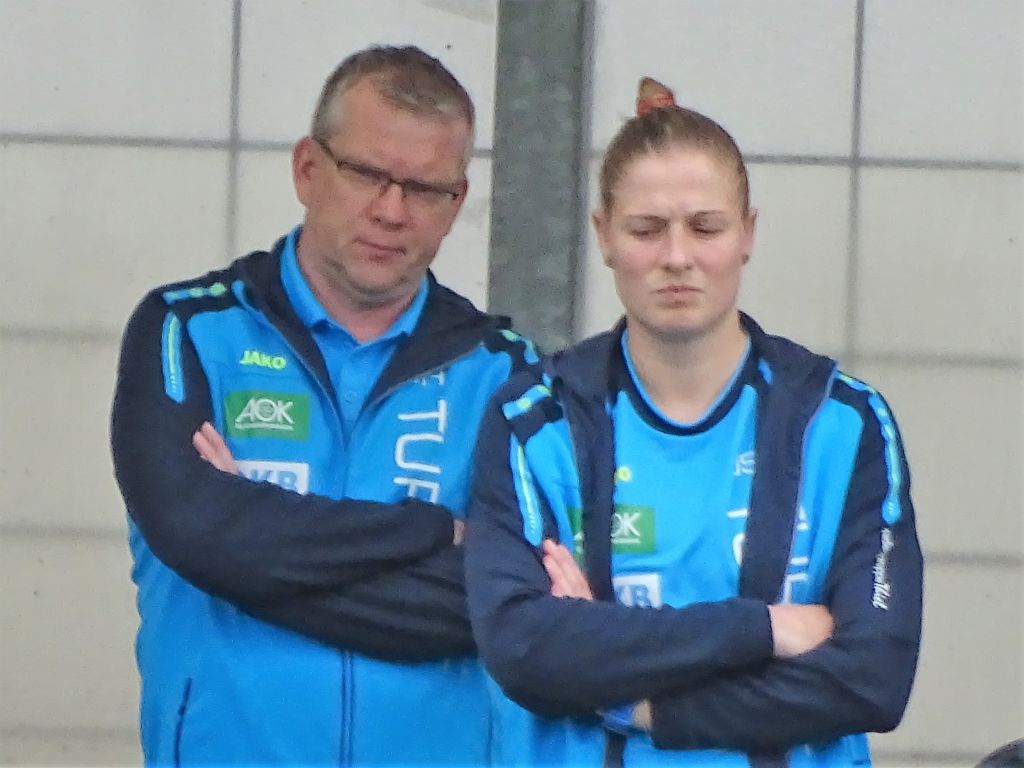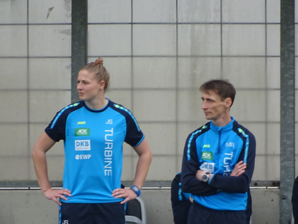 Doch dann sehnten sich die Turbinefans irgendwann das Ende der ersten Halbzeit herbei, denn der Anblick des zerfahrenen Spiels der blauen Kaninchen gegen die rot-weißen Schlange erzeugte ein allgemeines Leid. Den Torbienen gelang es nicht, ein eigenes Spielkonzept durchzusetzen. Der Ball kam kaum nach vorn durch, wurde zu oft durch die Mitte gespielt, für die Zweikämpfe ließen sich die bayrischen Spielerinnen weniger Zeit als die Turbinen, zahlreiche Fehlpässe erstickten aufkommende Hoffnungskeime, unser Sturm verkümmerte im Singledasein unseres Dampflökchen Svenja Huth. Die Mannschaft brauchte jetzt unbedingt eine Kabinen-Ansage, die wachrüttelte und Strategien aufzeigte! Aber was sie nicht brauchte, bekam sie kurz vor Halbzeitende: Es klingelte wiederholt im Potsdamer Torgehäuse. Ein Abseitstor – zum Glück!