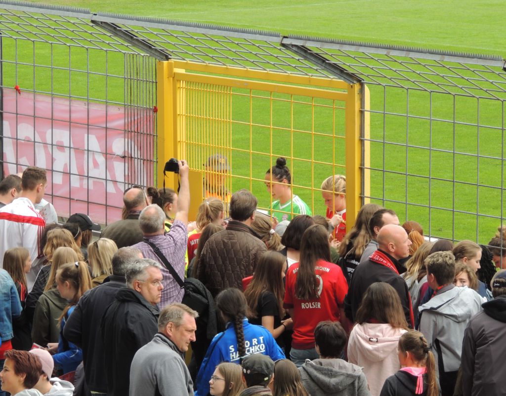 Der Fanbus, der an diesem Aprilsonntag zwischen 6.00 und 1.00 Uhr zweimal quer durch Deutschland fuhr, war gut gefüllt. Über das Bus-„Mikroskop“ wurden zur allgemeinen Aufklärung die umfangreichen Einlasskontroll-Regeln des FC Bayern bezüglich der Dinge, die ins Stadion mitgenommen werden dürfen bzw. deren Mitnahme nicht gestattet ist, verlesen. Erstaunlich viel neues Wissen, was ein erstes Kopfschütteln der stadionerfahrenen Frauenfußball-Fangemeinde verursachte. Denn das Klientel der Frauenfußballfans gilt aus freundlich, nett und gemäßigt.