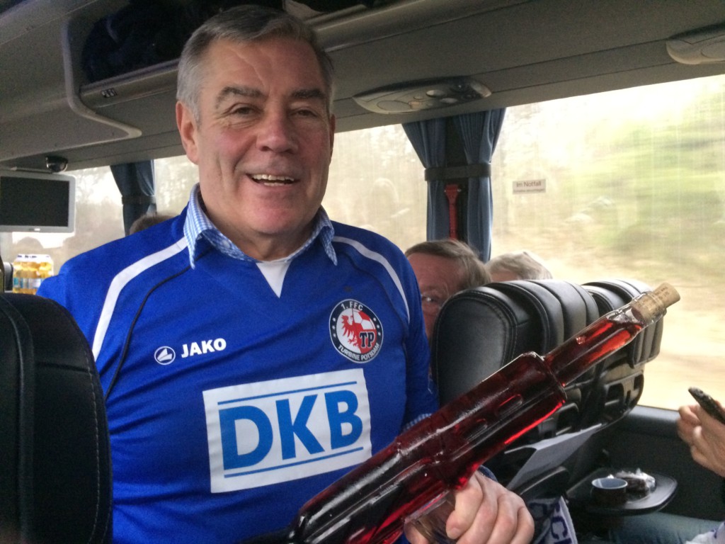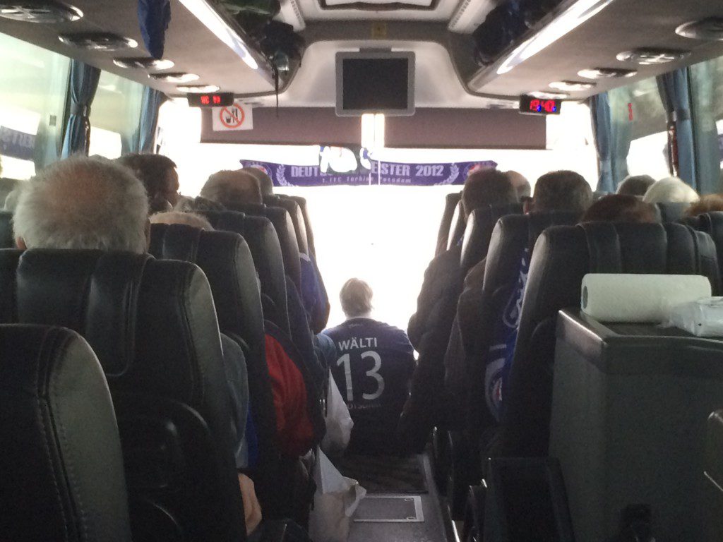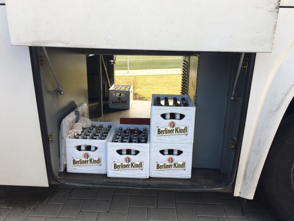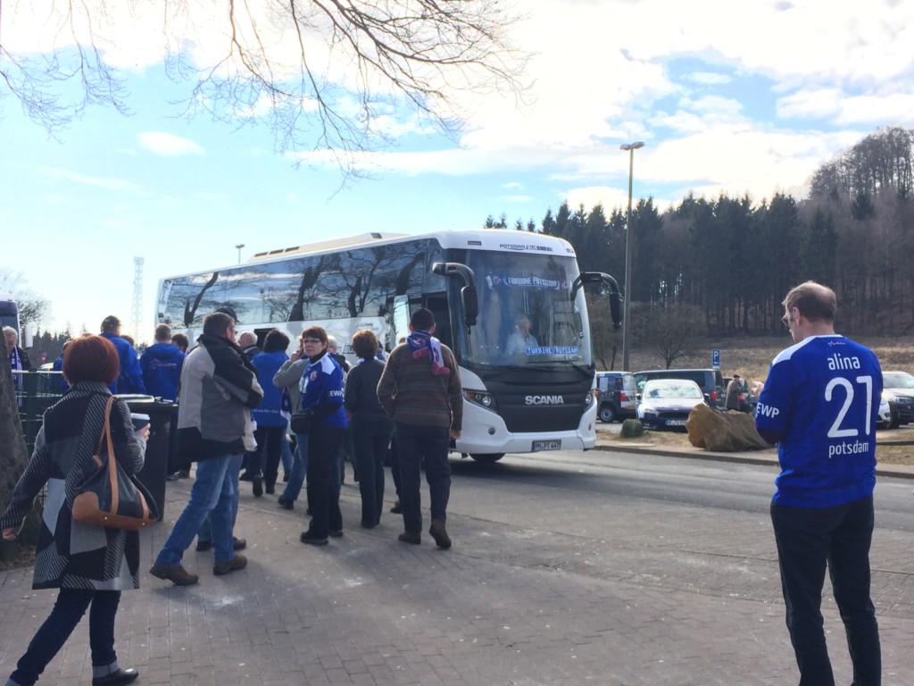 Eine feuchtfröhliche Anreise führte dazu, dass die Busfahrer über die aktuelle Wasserstandsmeldung der Bordtoilette informierten und einen Warnhinweis senden mussten. Die mitreisenden Bierkästen wurden rasant schnell geleert, da sich aufgrund der Winterpause die Geburtstagskinder und deren Geburtstagslagen aneinanderreihten und teilweise auf Wartelisten für die kommenden Fanbusfahrten verbannt werden mussten. Ein Jubilar an Bord versorgte einige Insassen mit leckerem Frühstück und Geburtstagskuchen. Rundum eine erlebenswerte Hinreise in prächtiger und ausgelassener Stimmung. Immerhin konnte man diesmal ausgeschlafen in den Bus steigen, der erst gegen 9.00 Uhr ab Potsdam startete.