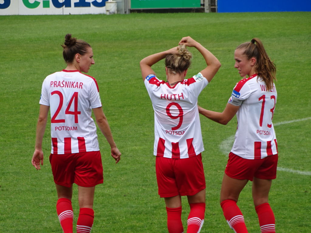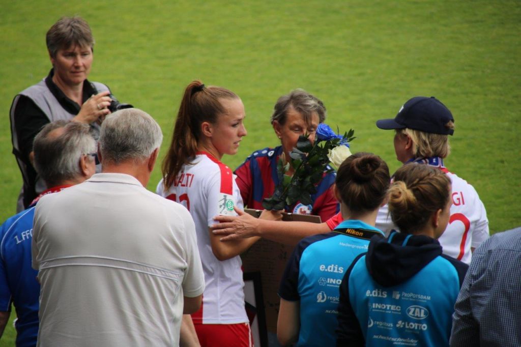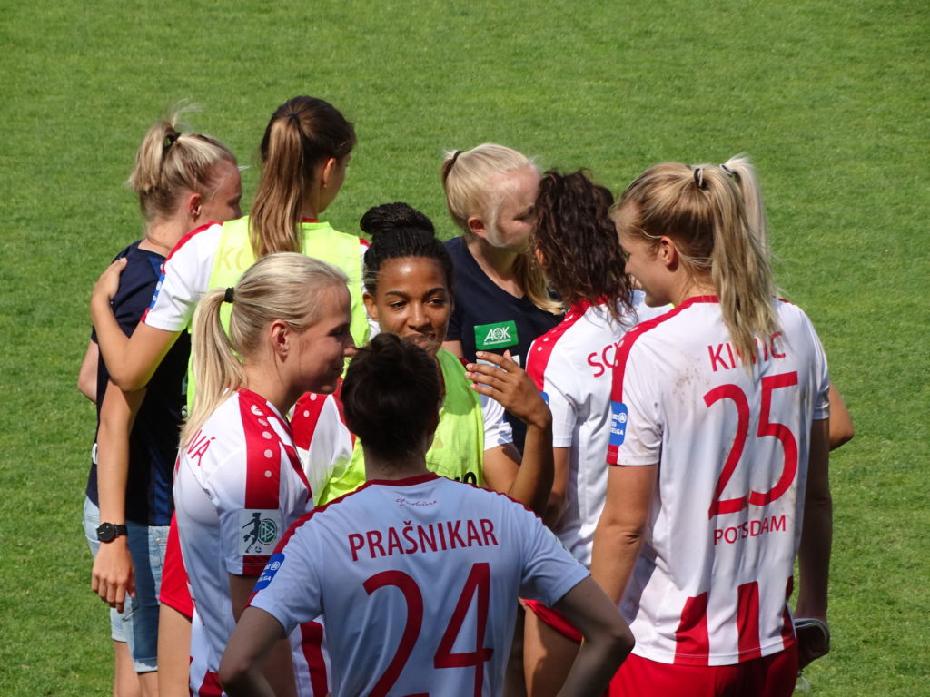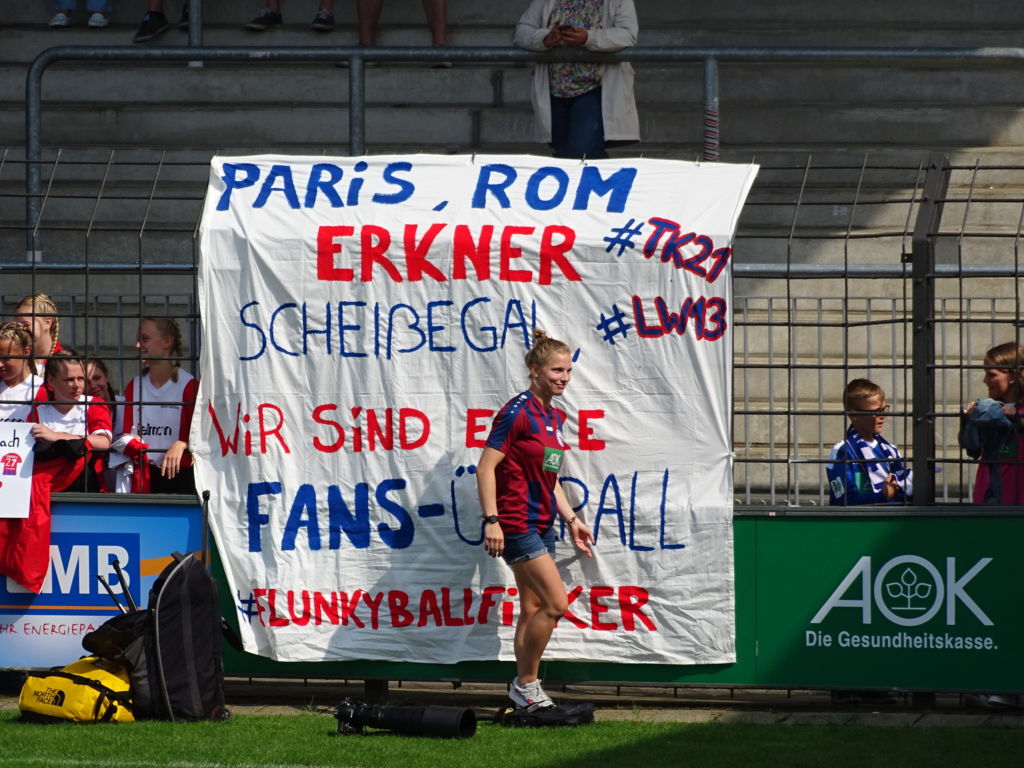Danach trocknete der laue Sommerwind die Tränen und es ging mit der Kapitänin an Bord volle Kraft voraus! Potsdam gewann die Überlegenheit und Nina Ehegötz kitzelte einen Elfmeter heraus. Feli Rauch versenkte diesen eiskalt im Netz – Ausgleichstor! Die Blockfahne wurde im Fanblock eilig entrollt und ein 1.600 stimmstarker Chor sang das enthusiastisches „Olé“.