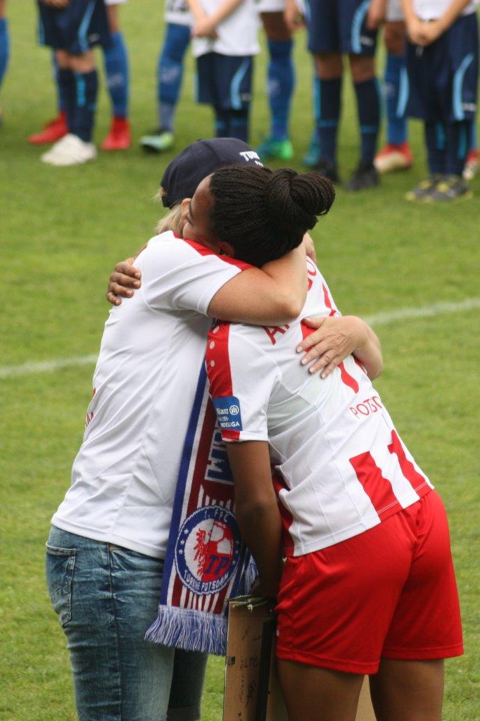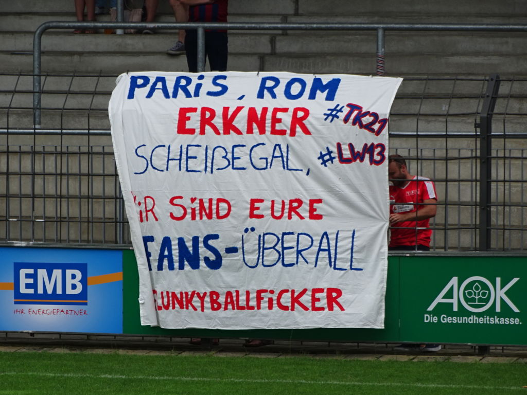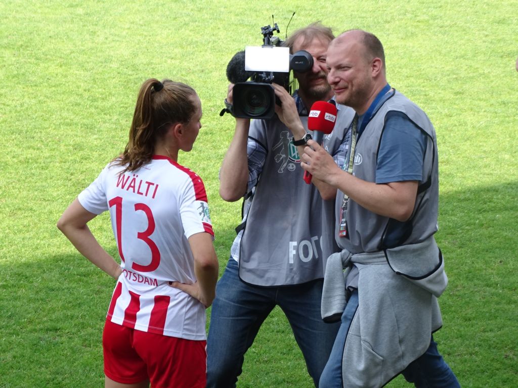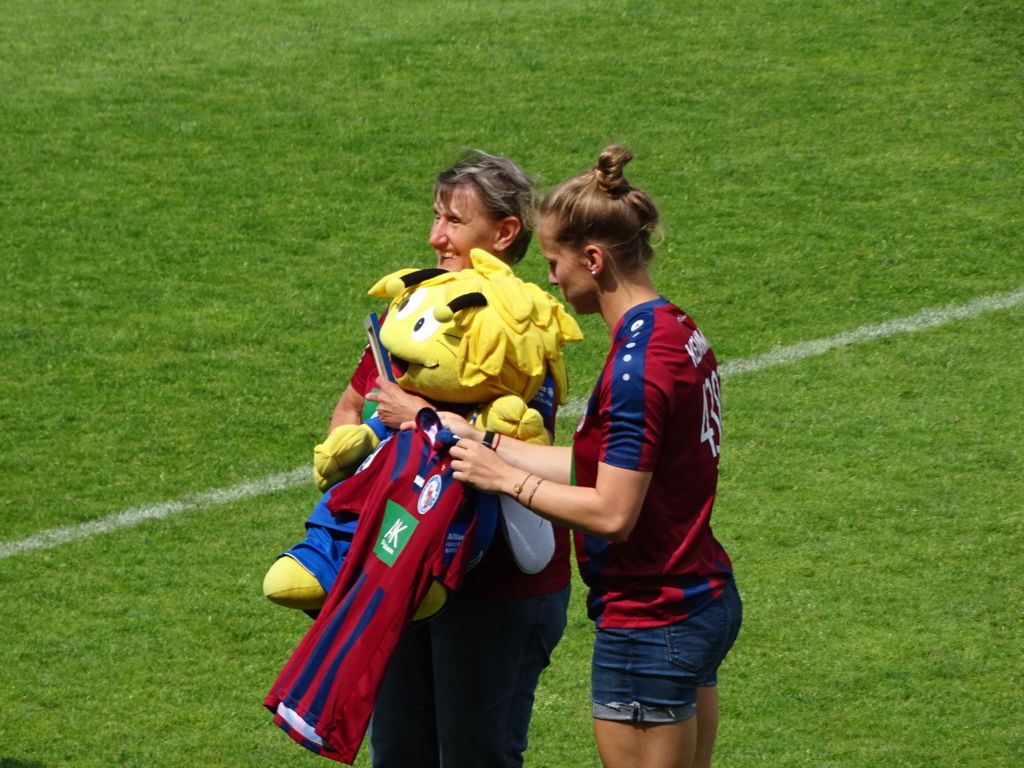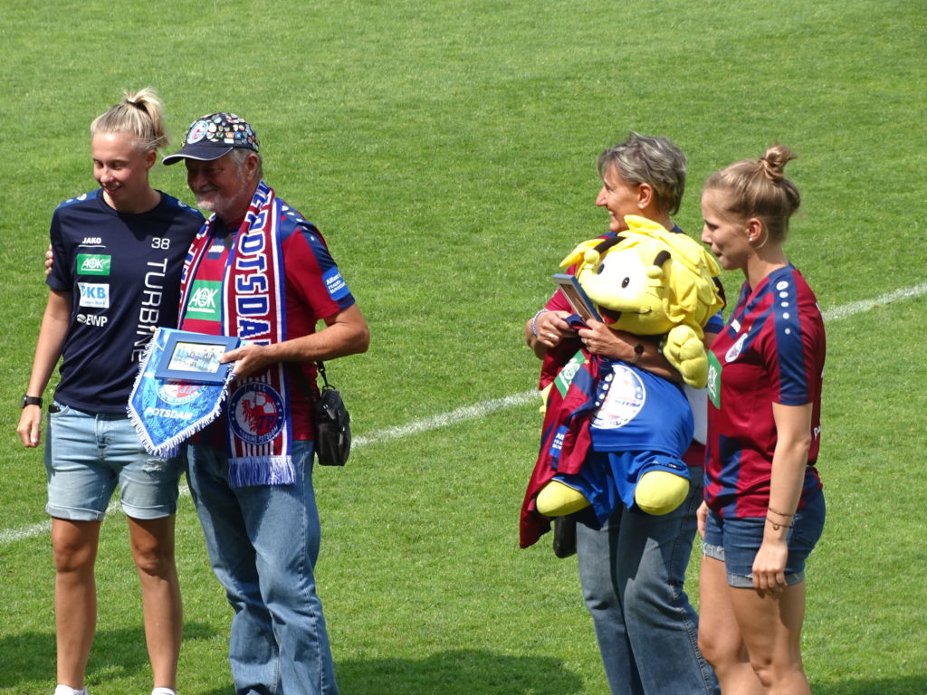 Danach trocknete der laue Sommerwind die Tränen und es ging mit der Kapitänin an Bord volle Kraft voraus! Potsdam gewann die Überlegenheit und Nina Ehegötz kitzelte einen Elfmeter heraus. Feli Rauch versenkte diesen eiskalt im Netz – Ausgleichstor! Die Blockfahne wurde im Fanblock eilig entrollt und ein 1.600 stimmstarker Chor sang das enthusiastisches „Olé“.