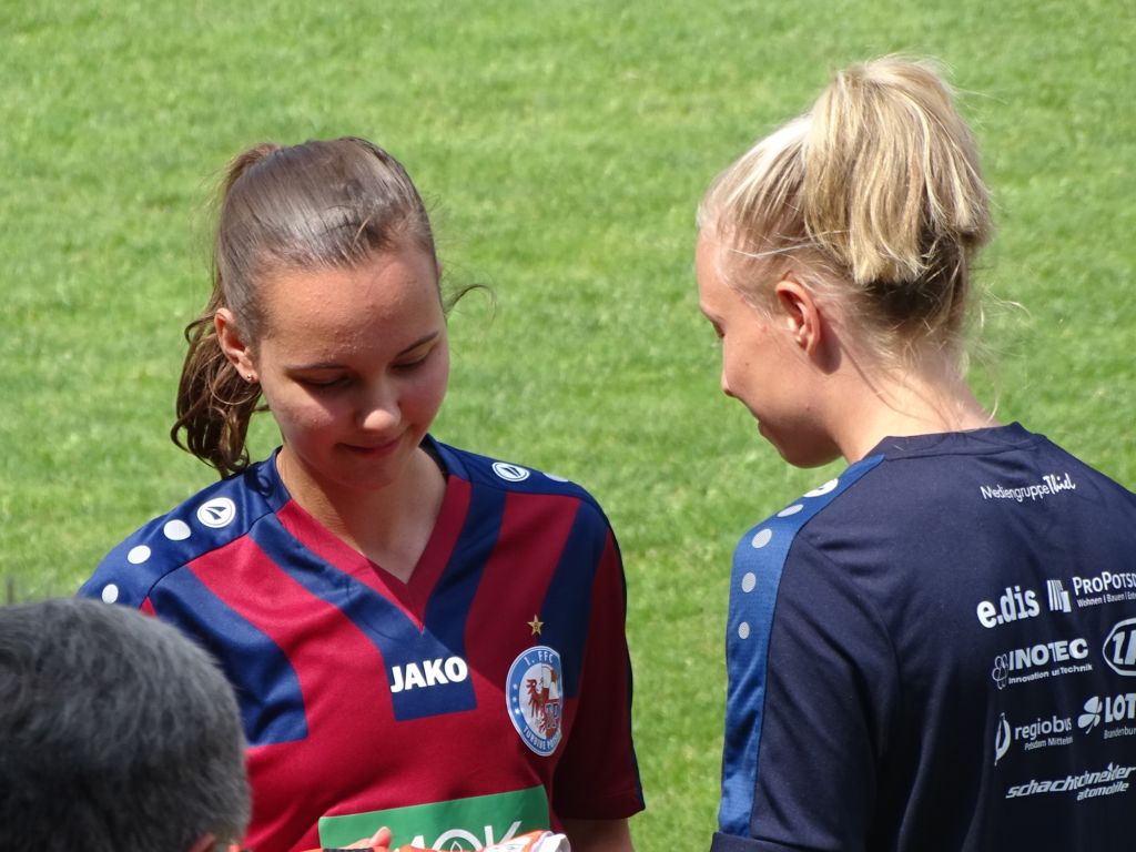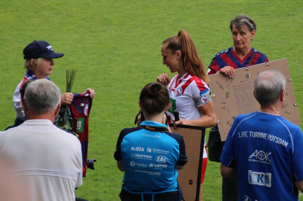 Kurz vor 14 Uhr liefen dann beide Mannschaften der 1. Bundesliga auf. Eine große Zeremonie bahnte sich an, denn es galt, fünf Spielerinnen zu verabschieden, darunter auch die Kapitänin und ein Turbine-Urgestein. Bereits im Spielertunnel kullerten die ersten Tränen über die Kapitänswange.