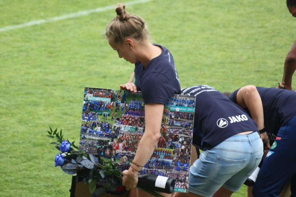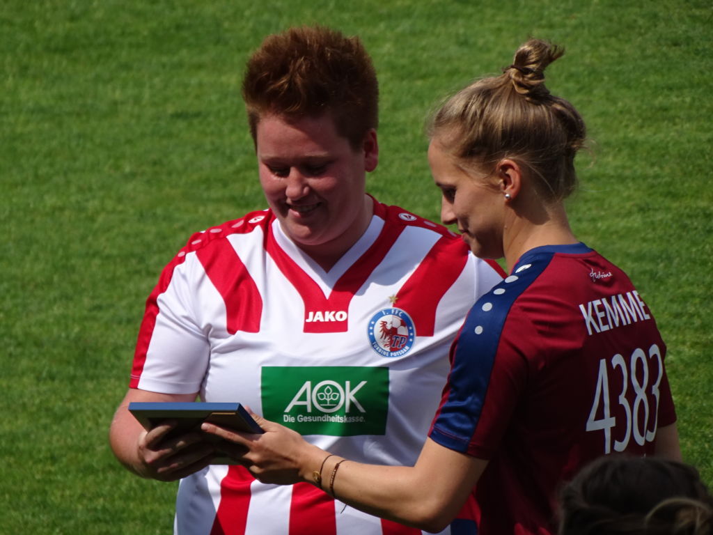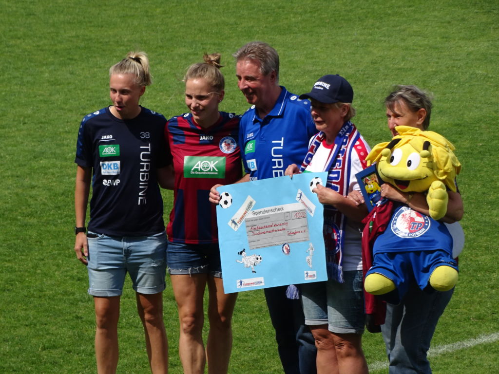 Die fünf Spielerinnen wurden vor dem Anpfiff vom Vorstand mit Sekt und gerahmten Trikots verabschiedet. Der Fanclub „Turbinefans“ reihte sich auf kreativ Art und Weise in die Dankesgemeinde ein und überreichte neben den mittlerweile traditionell sonderangefertigten blau-weißen Rosensträußen auch einige XXL-Foto-Collagen: Diese Unikate werden in mühevoller und zeitintensiver Kleinarbeit jedes Mal vom Fanclubmitglied Marina Hartmann gebastelt und werden sicherlich einen Ehrenplatz in den heimischen vier Wänden erhalten. Als Schmankerl überreichte der Fanclub nalle Spielerinnen, die 5 Jahre und länger dem Verein zugehörig waren ein Saisontrikot, das auf dem Rücken die Anzahl der Vereinstage anzeigte. Danke hier an die Ideengeberin und Strichlisten-Erstellerin: Mini sowie an Dagi und den Fanshop, welche die praktische Umsetzung möglich machten.