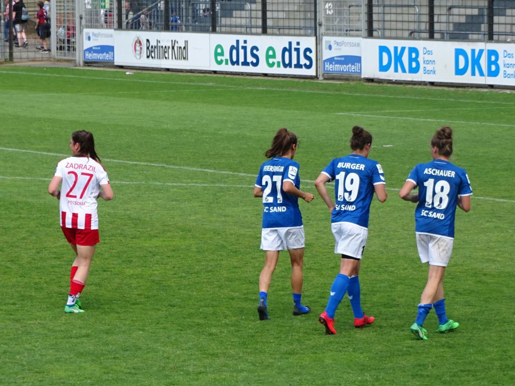 Am letzten Spieltag der Saison 2017/18 wurde doppelt so viel Fußball gespielt wie sonst. Bevor der FC Sand zur Sonntagnachmittags-Kaffeezeit im „Karli“ begrüßt wurde, stand der Stadionrasen für das U17-Halbfinal-Rückspiel Turbine Potsdam gegen den FC Köln an. Besonders auffällig und bewundernswert zeigte sich hier übrigens die Kölner Trainerin, die mit einer fulminanten, überbordenden Körpersprache die Mannschaft vorantrieb und die Bedeutung des Spiels ganz klar einzuordnen wusste.