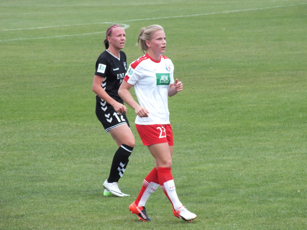 Zwar gaben die Turbinen in der 15. Minute den Freundinnen aus Jena den Vortritt, indem Lisa Schmitz den Ball nach Amber Hearns Torschuss zwar griff, aber nicht hielt. Aber na ja. Die Kapitänin Feli Rauch schickte die Antwort genau 15 Minuten später ins gegnerische Tor. Auch das 2:1 durch Svenja Huth fiel noch in der 1. Halbzeit.