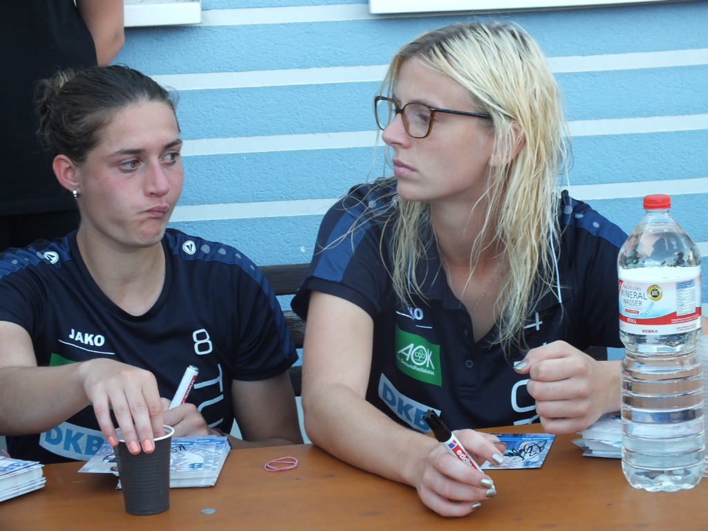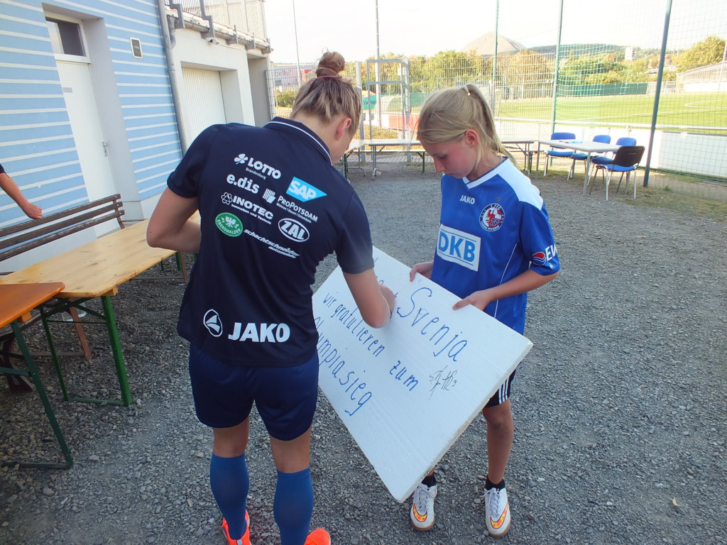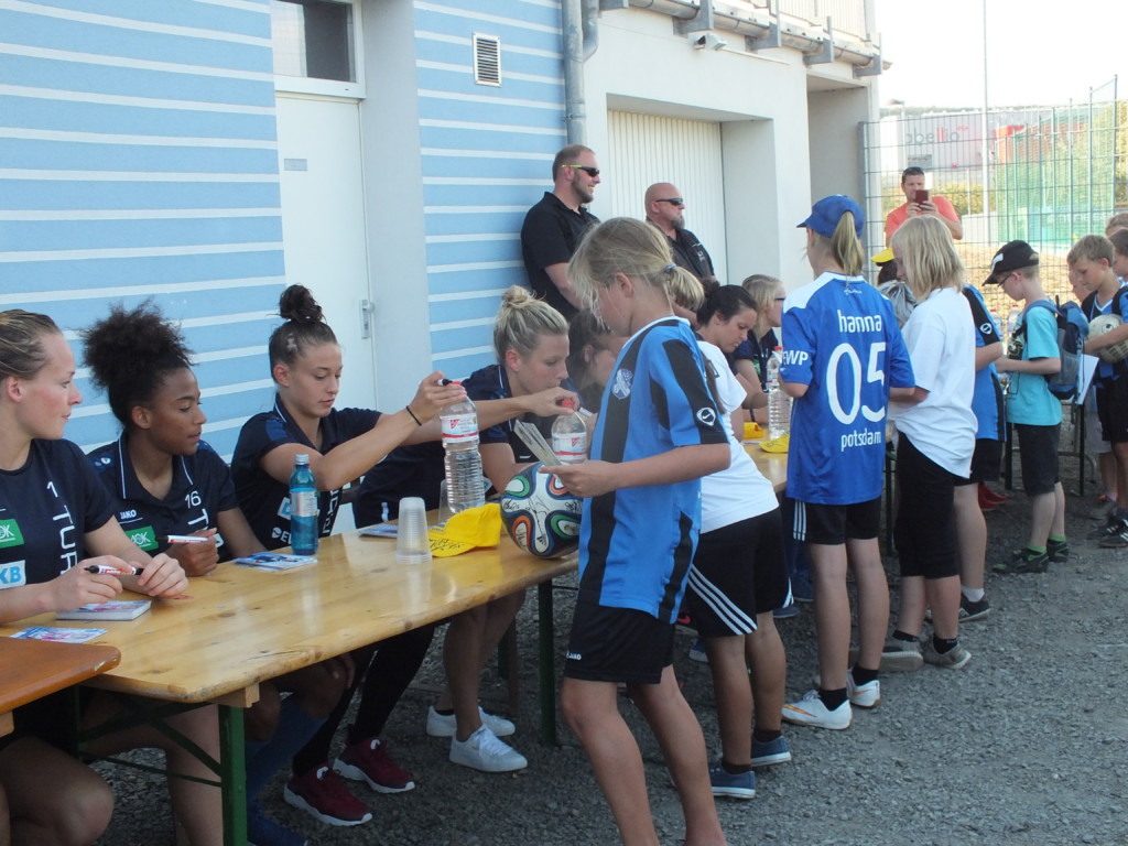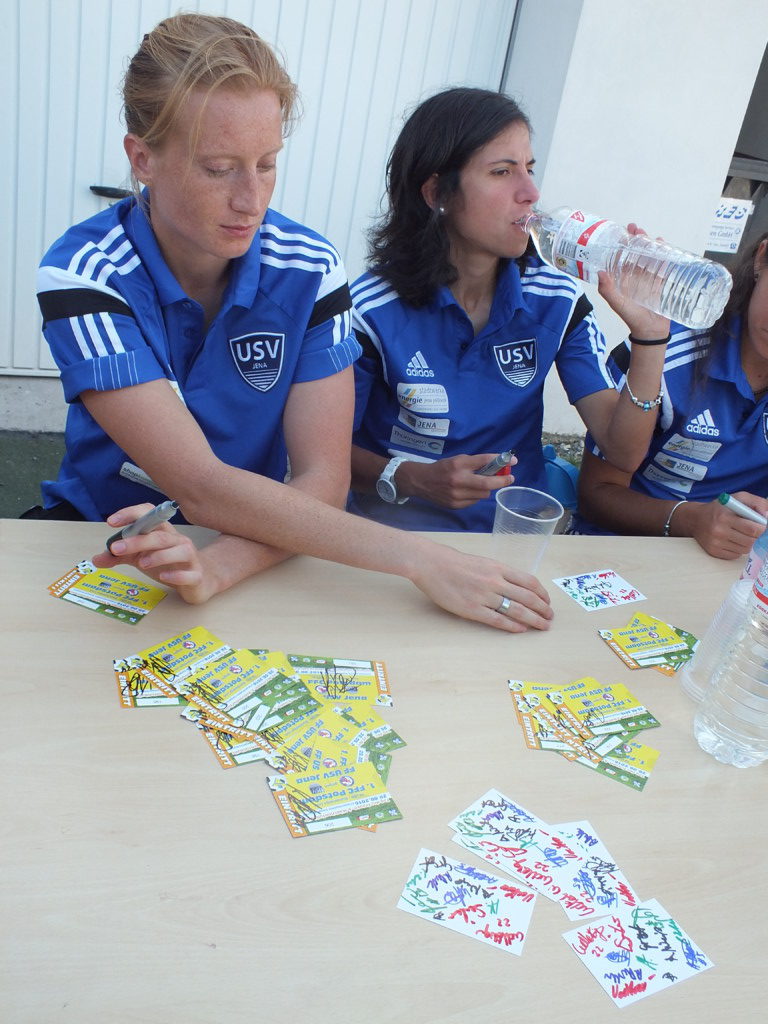 Hinterher gab es eine Autogrammstunde für den fußballerischen Nachwuchs der Region und für alle anderen Zuschauer_innen und Fans. Die Turbinen präsentierten ihre neuen Autogrammkarten, teilweise mit Goldprägung (Kemme und Huth). Die Spielerinnen aus Jena mussten dagegen mit den Rückseiten der übrig gebliebenen Eintrittskarten oder einem weißen Bogen aus der 500 Blatt-Koperpapier-Packung vorliebnehmen, da sie noch? nicht? mehr? über Autogrammkarten verfügten. Dafür hatten sie aber neue tiefschwarze Auswärtstrikots an, die an Frankfurts Glanzzeiten erinnerten.