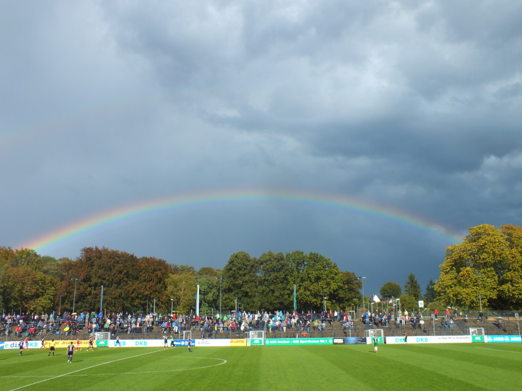 Inmitten dieser nassen Dunkelheit wurde die zweite Halbzeit angepfiffen und fünf Minuten später konnte man eine leichte Schattenbildung auf dem Rasen beobachten. Und dann, ja dann… gab es von der Haupttribüne aus etwas Wunderschönes zu entdecken: Ein leuchtendbunter Doppel-Regenbogen zog sich von der einen zur anderen Eckfahne. Etliche Fans griffen nach ihren Fotoapparaten und Handy-Apps, um dieses Naturschauspiel festzuhalten. Erst, als in der 58.Minute der ersehnte Tortreffer durch nun bereits zwei Torwartfrauen abgewendet wurde, war man wieder vollständig bei der Fußball-Sache. Auf der Linie hatte eine Sander Abwehrspielerin nach einem Strafraumgewusel die Flugroute des Balls doch noch umlenken können.