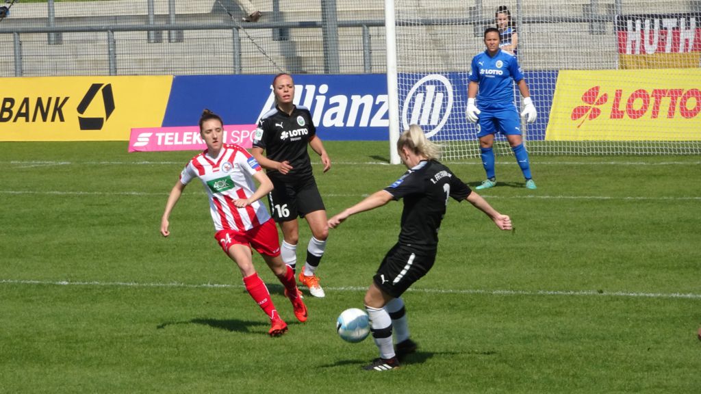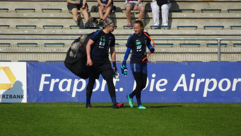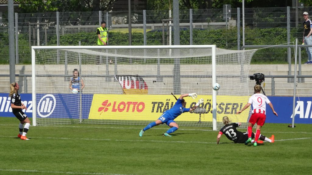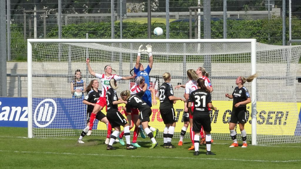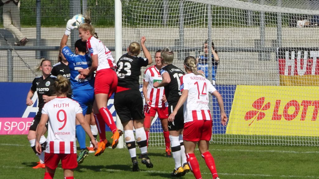 Potsdam bestimmte insgesamt das Spiel, verzeichnete den höheren Ballbesitz, schoss an den Pfosten und schoss ins leere Frankfurt-Gehäuse, das nur noch von einer Abwehrspielerin verzweifelt bewacht wurde, zweimal direkt nacheinander nicht hinein. Frankfurt war viel leichter als Bayern München oder der SC Freiburg zu handhaben – aber Potsdam machte nichts daraus. Noch dazu zeigte sich die Ex-Turbine-Torhüterin Bryane Haeberlin in bester Verfassung und rettete die Hessinnen ein ums andere Mal souverän. Das gefühlte 5:0 blieb aus. Zum Glück wusste Frankfurt die Potsdamer Fehler nicht zu nutzen, sodass unterm Strich nichts passierte – außer dieses eine Törchen durch Svenja Huth.