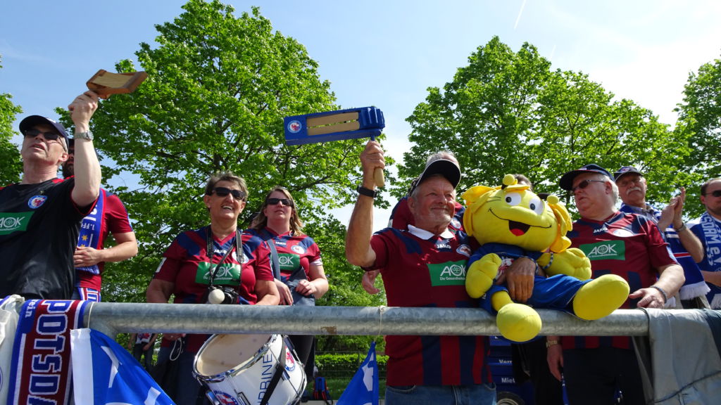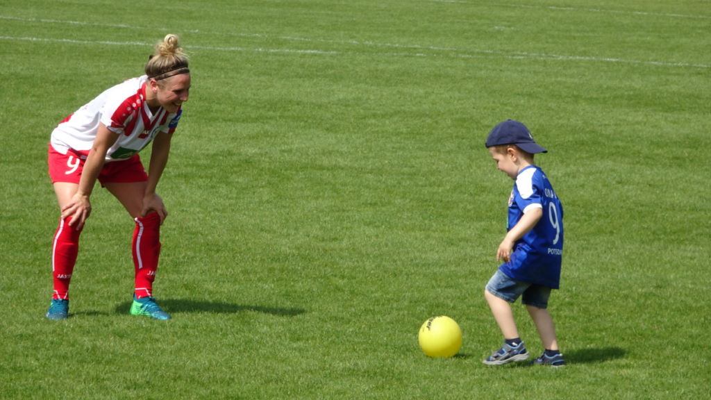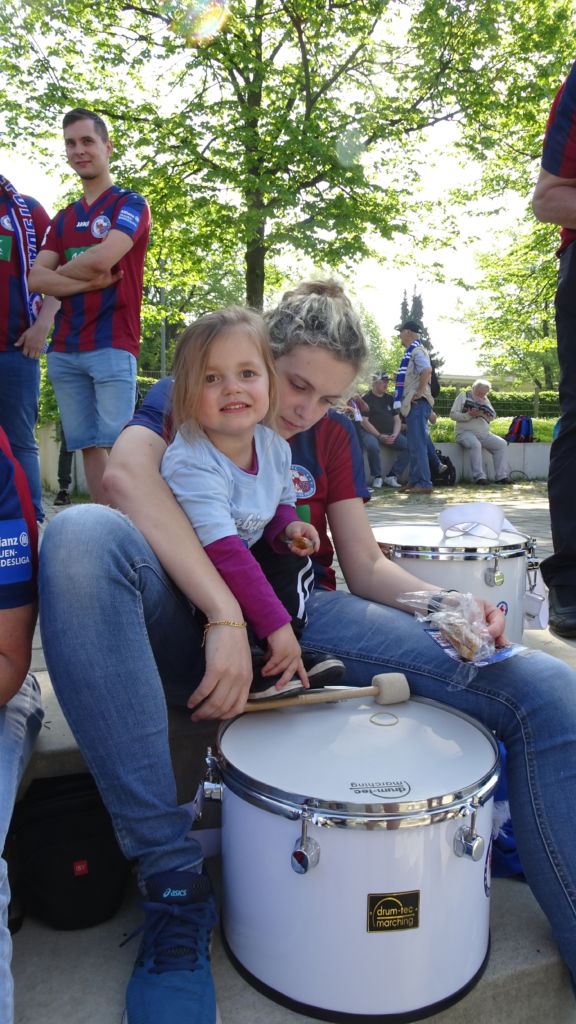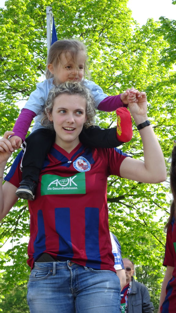 Für minderjährige Mitreisende gab es auch ein Kinderbetreuungsangebot an Bord, in Form von Reitkursen auf dem Rücken eines unermüdlichen Fans und zukünftiger FSJ-ler. Die Nachwuchs-Torhüterin der F-Jugend von Turbine Potsdam namens Celine fühlte sich somit im Fanbus pudelwohl.