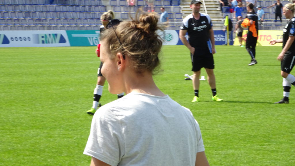Es entspann sich ein schnelles und kampfbetontes, aber unerwartet faires Spiel! Die erste Torchance in der 3. Minute erarbeitete sich Potsdam, als Jojo Elsig nur knapp über das vernetzte Revier von Almuth Schult köpfte. Dann jedoch die totale Ernüchterung, als die Schiedsrichterin bereits in der 6. Spielminute auf den Wob-Elfmeterpunkt zeigte. Caroline Hansen nutzte diese Chance souverän, 1:0 für Wolfsburg, im Heimspielstadion!