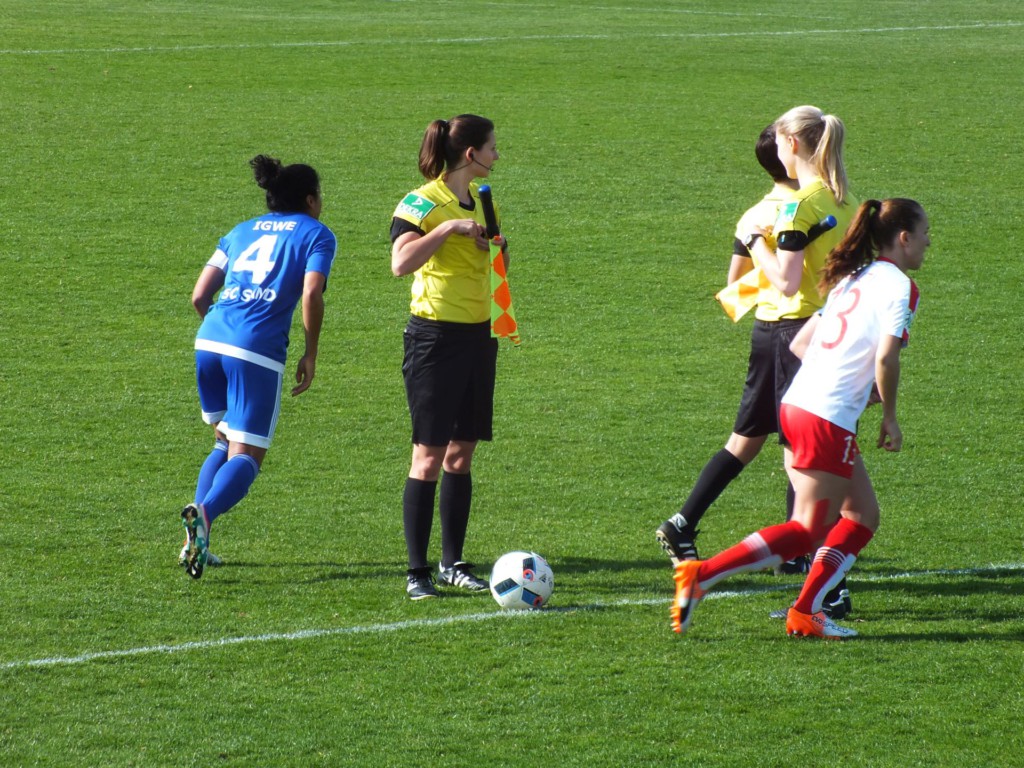 Es regnete Tore, drei in der ersten und drei in der zweiten Halbzeit – erzielt von sechs verschiedenen Torschützinnen: Kiwic, Gasper, Kemme, Schmidt, Aigbogun, Ehegötz. Und es hätte sogar noch kräftiger „regnen“ können, denn manche Torchance wurde vergeben – oder von den beiden imposanten „Abseitsrichterinnen“ (gewöhnlich auch Linienrichterinnen genannt) gar nicht erst zugelassen. Zu oft und zunehmend weniger nachvollziehbar wurde das gelbe Fähnchen im Gütersloher Wind hin- und hergewedelt. Das führte unter den Fans anfangs zu Protest, später zu kopfschüttelndem Gelächter. Irgendwann endete der humorvolle Sarkasmus in einem Fangesang: „Wir – wolln – die Faaaahne sehn, wir wolln die Fahne sehn, wir wolln, wir wolln die Fahne sehn.“