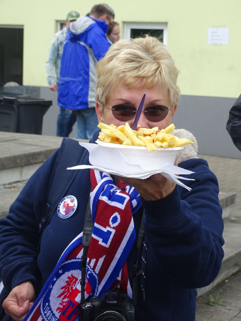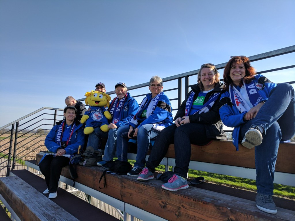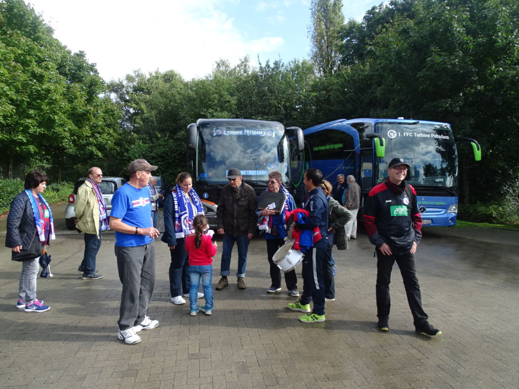 Nach einer gewohnt feuchtfröhlichen Anreise mit „Unterleibskuchen“ (Pflaumenkuchen) und charmanter Busfahrer-Moderation erreichte man nach fünf Stunden das Stadion, das von seiner Größe her ideal zu den Frauenfußball-Bedürfnissen passt. Nicht zu groß, mit freier Platzwahl, nah am Spielfeldrand. Zwar wurde auf dem Spielfeld Kunstrasen ausgesät, was den „Torbienen“ anfangs etwas Probleme bereitete, aber der Rest stimmte einfach: