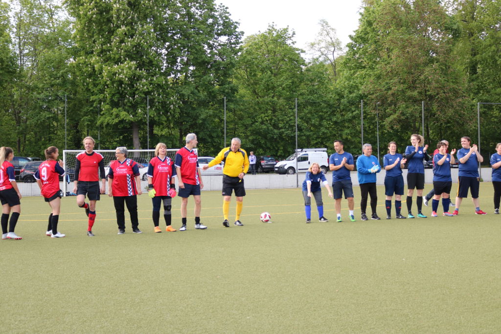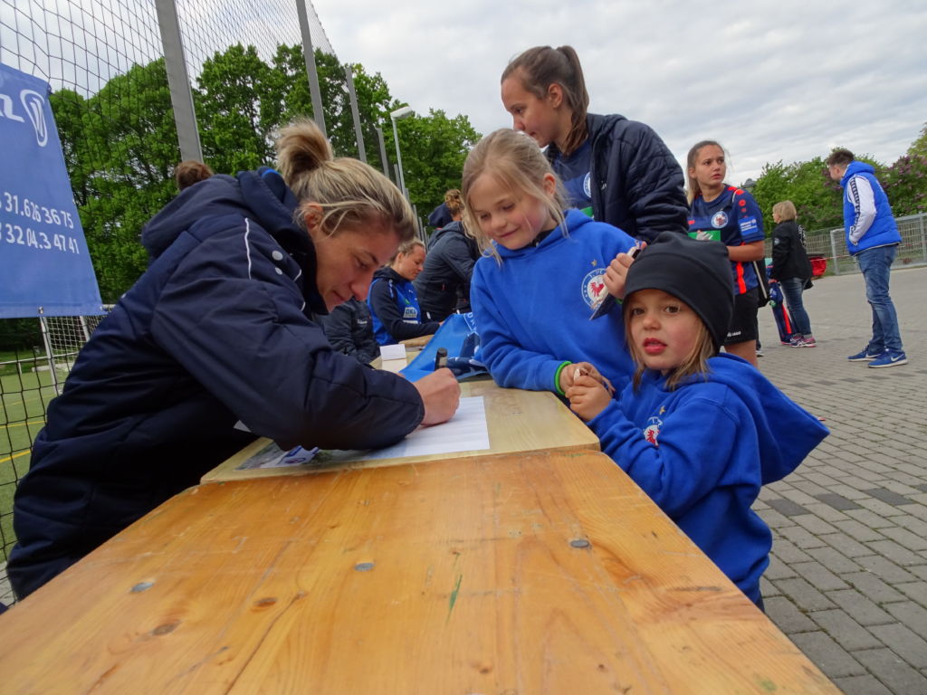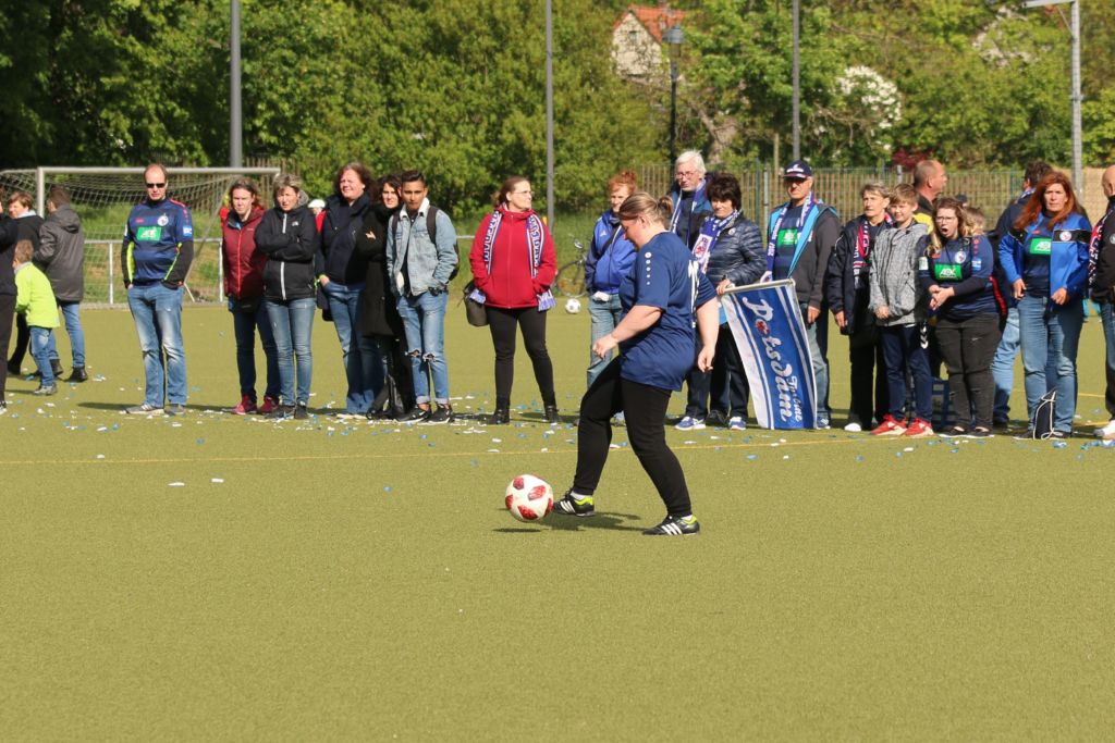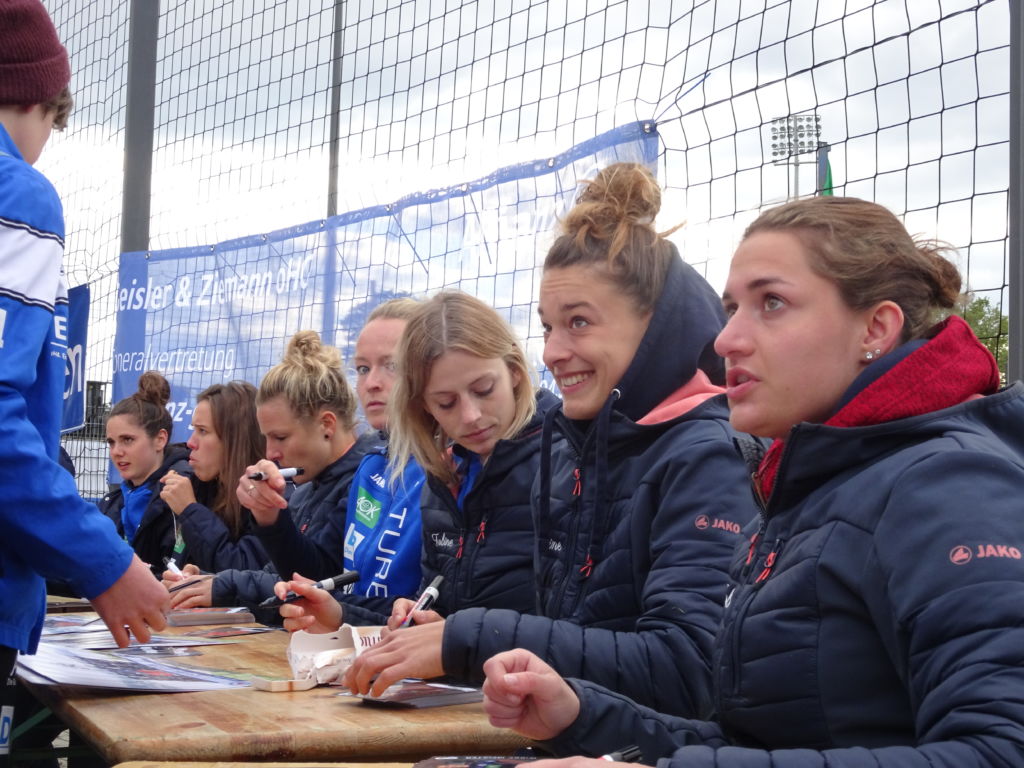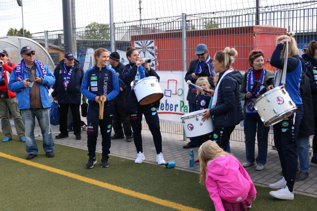 Die Lieblingsmannschaft kam nach dem Abpfiff zum Verbeugen und gemeinsamen Jubeln an den Spielfeldrand. Und Wiebke Meister bekam Geburtstagsblümchen und einen Kaffee-Gutschein mit ganz viel Zucker gereicht.