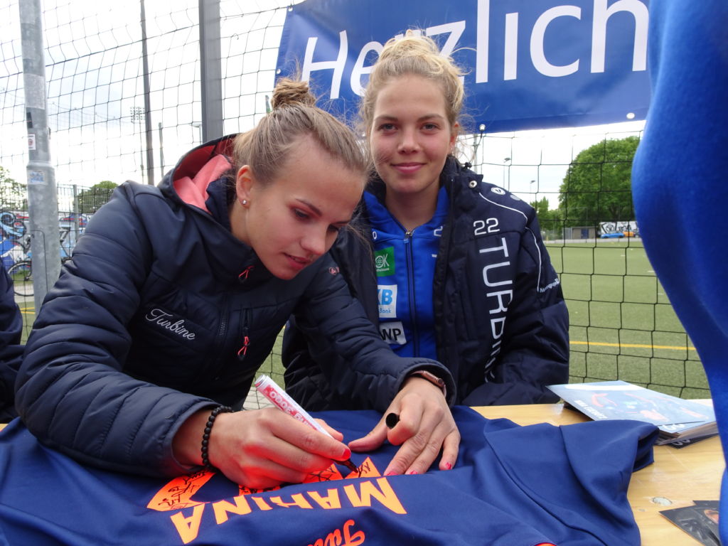 Es gab ein Wiedersehen mit Rieke Dieckmann, einer ehemaligen, stets lächelnden Turbi(e)ne, die als Bremer Kapitänin auflief. Und die sich beim Abklatschen nach dem Spiel sichtlich freute, die Potsdamer Fans wiederzusehen. Und es gab eine überraschende Beobachtung: Einige Turbinen liefen mit einem selbstgebastelten „Pulswärmer“ auf, der den Code „SC 29“ trug. Ein Gedenken an „Selin–A“ Cerci, die sich beim letzten Spiel einen Kreuzbandriss zugezogen hatte. Purer Mannschaftsgeist!