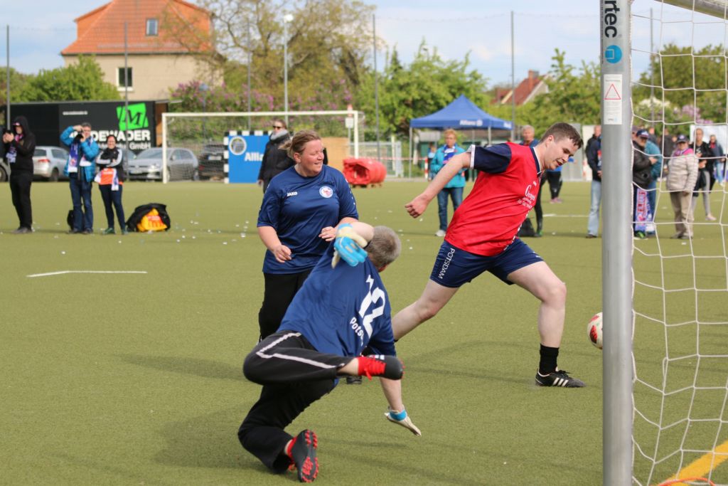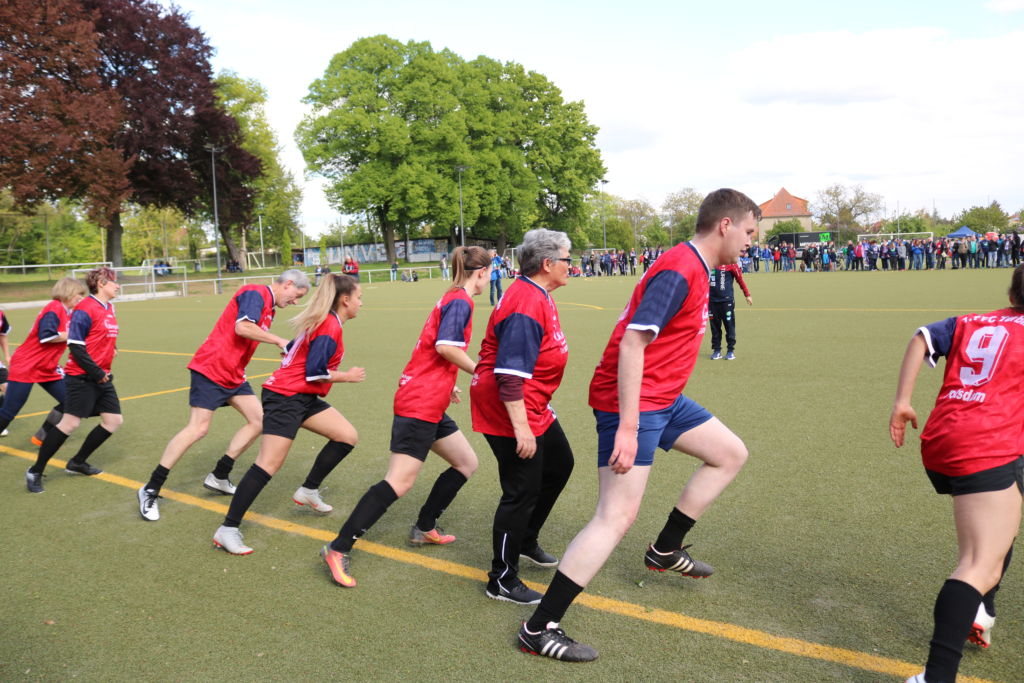 Mit einem 0:1 ging es in die Halbzeitpause. Diese nutzte Edelfan Daggi, um sich vom Mittelpunkt des Rasens ein übergroßes Gummitier in Form eines Dinosauriers abzuholen. Der Sponsor des Tier- und Erlebnisparks Germendorf hatte diesen Trostpreis für das Fan-Halbzeitspiel gestiftet.