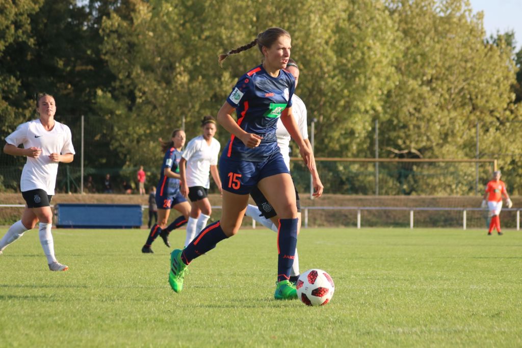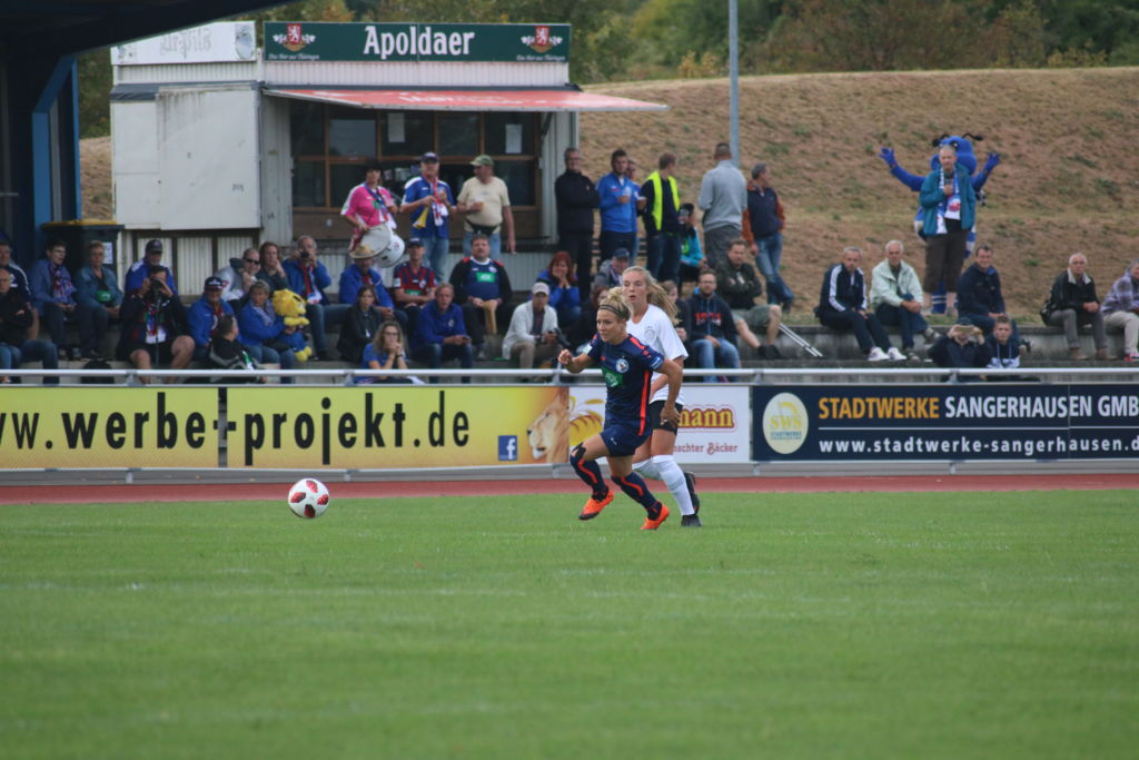 Turbine startete gut in die Partie, bestimmte zunehmend das Spiel und hielt sich überwiegend in der gegnerischen Hälfte auf. Und Bianca Schmidt schien zu einer neuen Höchstform aufzulaufen, denn sie bot – wie bereits eine Woche zuvor beim Spiel gegen die amerikanische Testspielmannschaft – Anlass zum Torjubel. 1:0 – so konnte es weitergehen. Und das tat es dann auch, denn in der 40. Minute stand Svenja Huth bereit für das 2:0. Die in der Luft wedelnde Abseitsfahne wurde vom Schiri nachträglich ignoriert, das Tor zählte. In der Halbzeitpause zeigte der Linienrichter, vermutlich seit mindestens 60 Jahren auf dem Platz stehend, sein wahres Können: Er zeigte eine wunderbare Fußball-Jonglage.