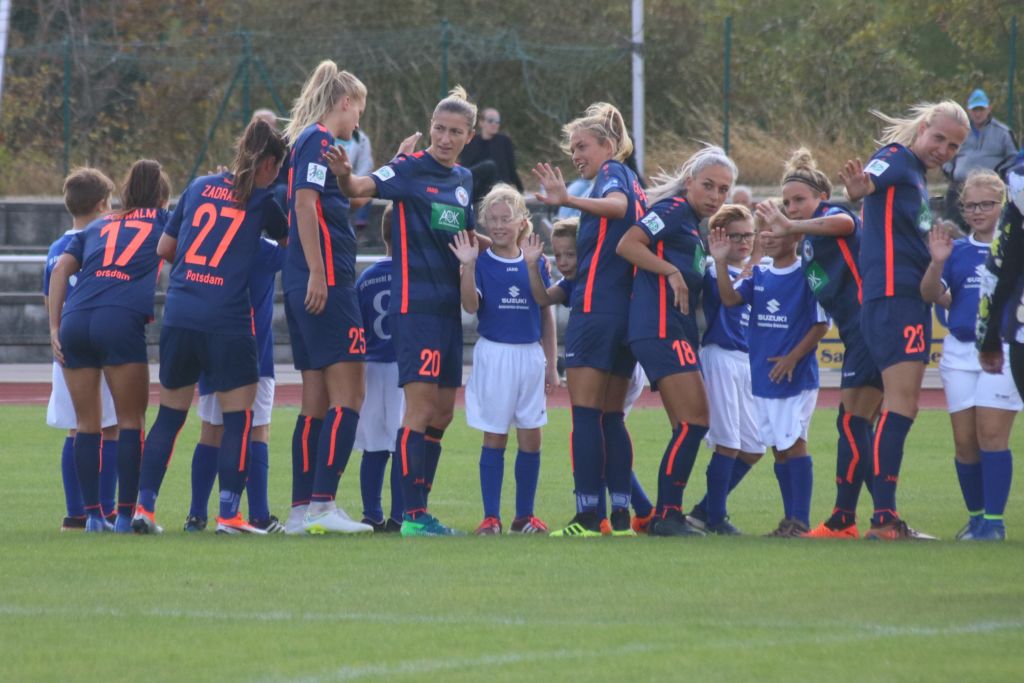 In der zweiten Halbzeit wurde bei Potsdam kräftig durchgewechselt und das Spiel begann dahinzuplätschern. Zu oft probierten es die Potsdamerinnen durch die Mitte – anstatt die Flügel zu bedienen. Auch wenn die Spielweise nicht so recht zu überzeugen schien, klingelte es dank eines „meeeeterweiiiten“ Abseitstores – jedenfalls nach Meinung der wissenden Turbinefans – zum 3:0, geschossen von Melissa Kössler. Und während das große Turbine-Maskottchen plötzlich wie ein Pfeil die Tartanbahn zur Ehrenrunde entlangschoss und die Fans ihren „Olé-olé“-Gesang zelebrierten, erhöhte Anna Gasper auf ein 4:0. Da man aber den Spielverlauf an einer Hand abzählen wollte, kam die eingewechselte Lara Prašnikar des Wegs und erhöhte auf ein nettes 5:0. Eine fette Ausbeute, obwohl die Spielweise nicht so sehr begeisterte. Das Tor, das am Ende unter den Fans am meisten diskutiert wurde, war das 5:1 – der Ehrentreffer für die Pragerinnen.
